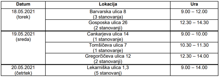 Ogled nepremičnin bo organiziran v terminih, ki so navedeni v spodnji tabeli. Za ogled ni potrebna predhodna najava, individualni ogledi pa niso možni.
