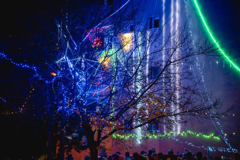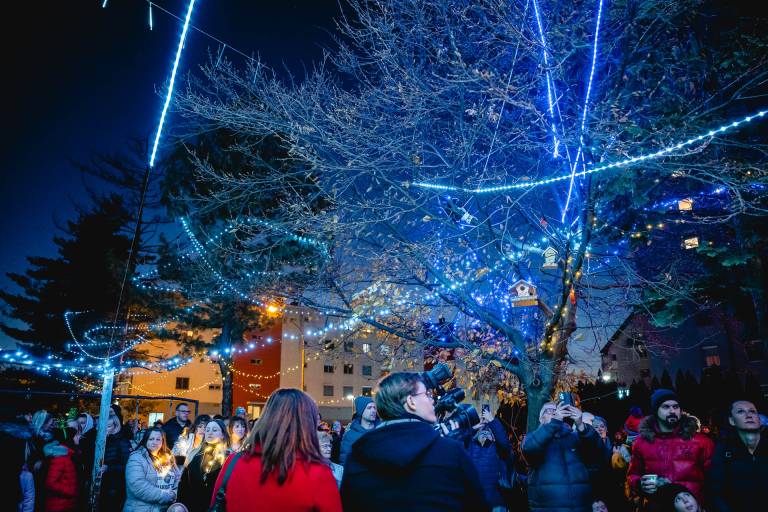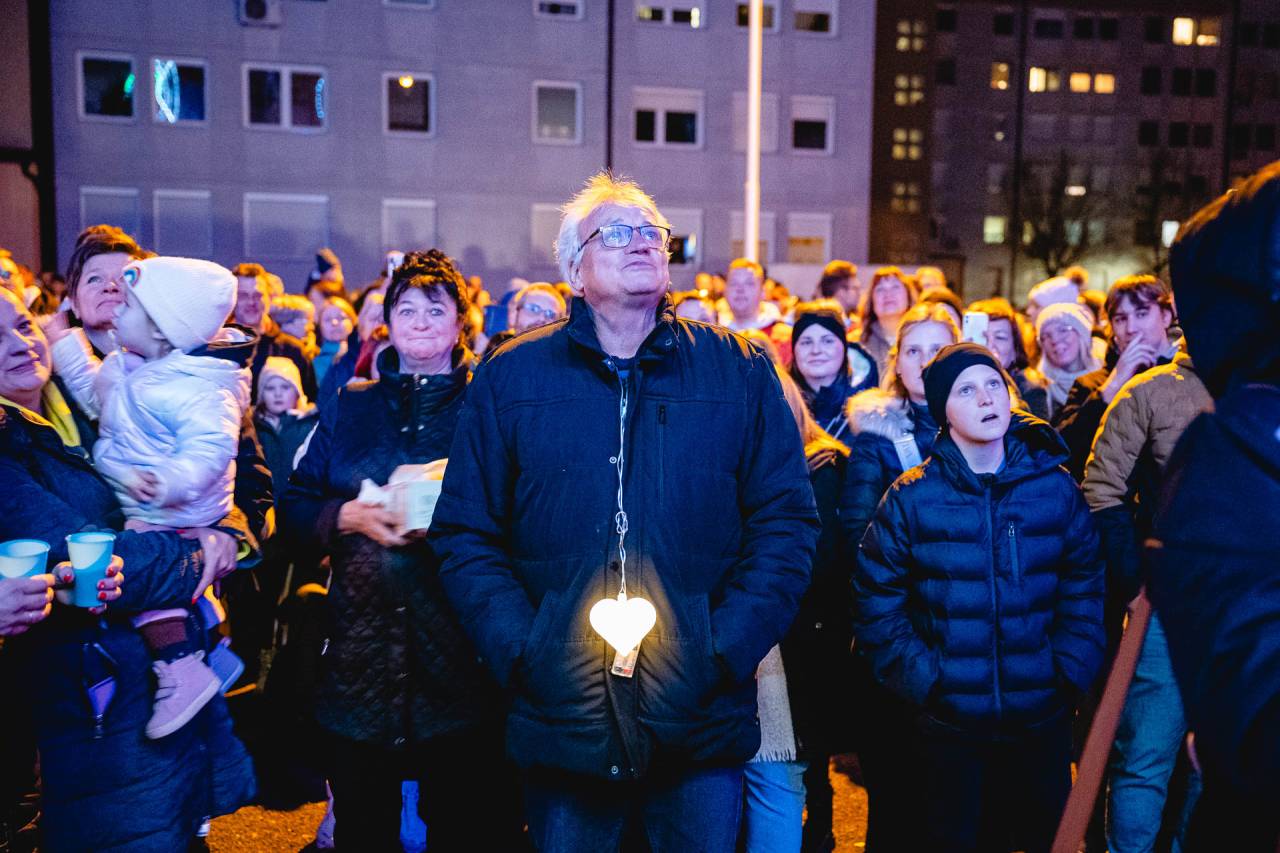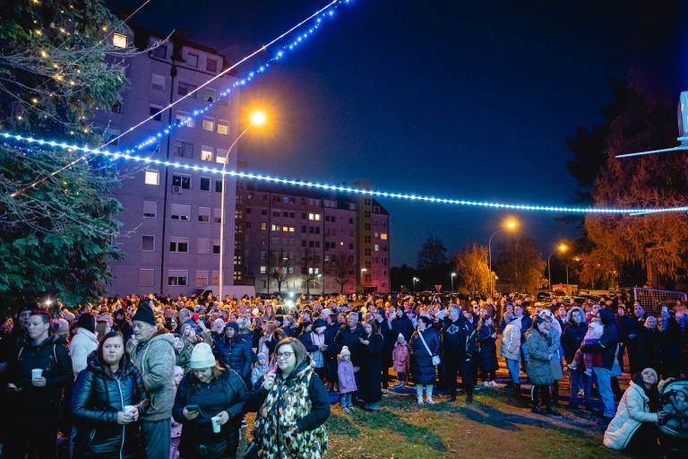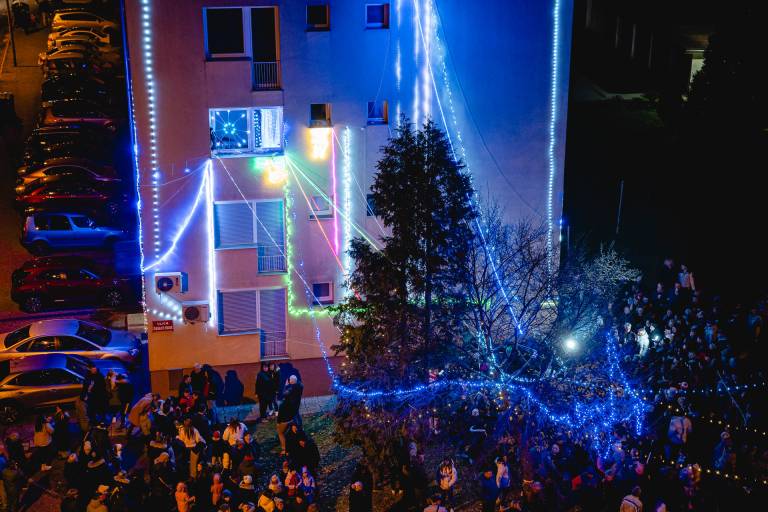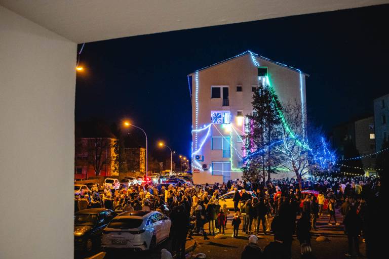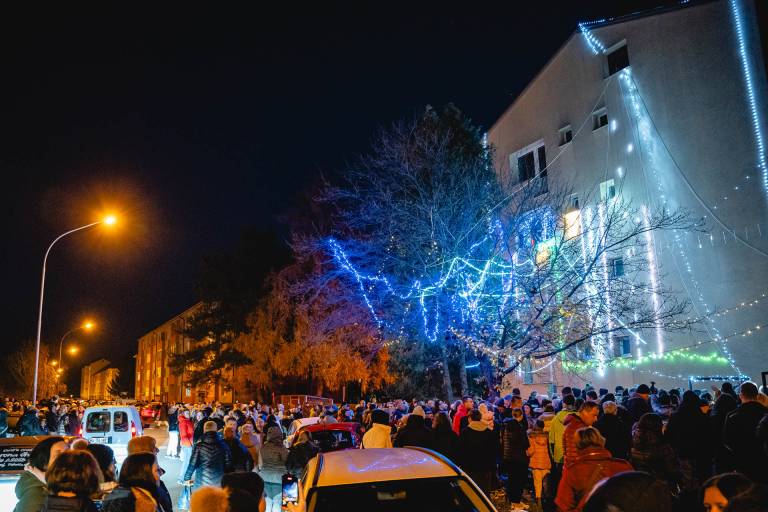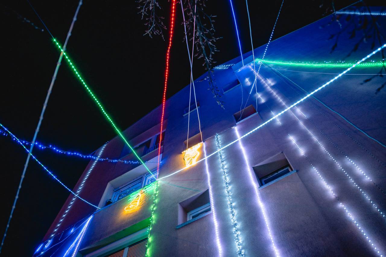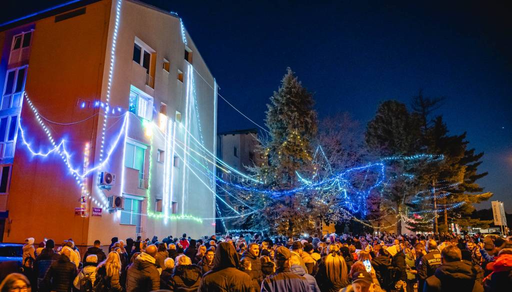 V zadnjih dneh so sosedje po blokih na Teznu razobesili plakate z napisom: “Gremo na lučke, da se nam zasvetijo učke!”. Slavko Roškar je tudi letos okrasil fasado bloka na Keleminovi ulici 2 in s prižigom lučk privabil več kot 100-glavo množico.