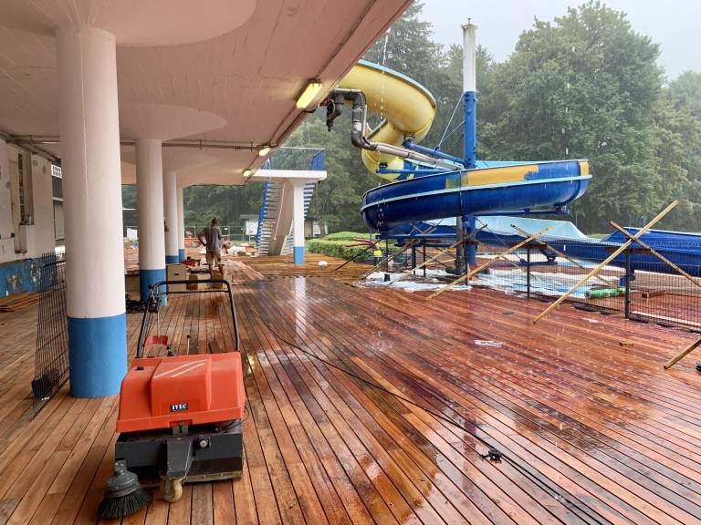 »Kompletna bazenska ploščad je obložena z zelo kakovostnim lesom. Prav tako so obnovljene javne sanitarije, dodatno so usposobljene še sanitarije za invalide,« nam je v torek ob deževnem ogledu Mariborskega otoka povedal direktor Športa Maribor Ranko Šmigoc.