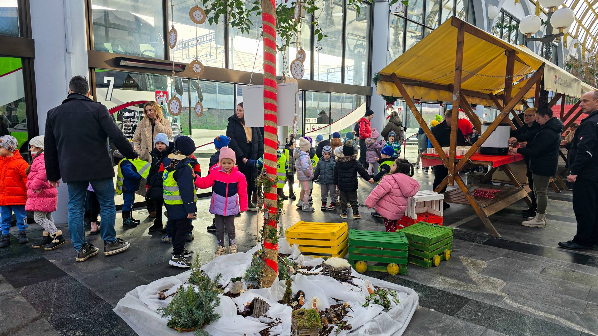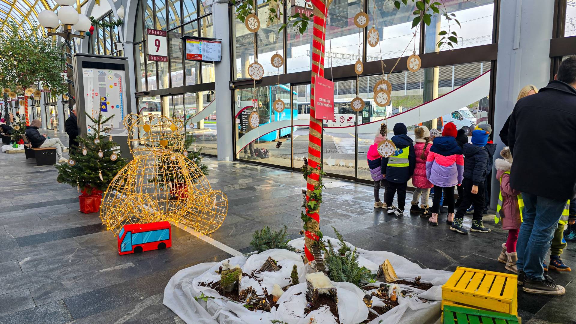 Glavna avtobusna postaja v Mariboru je tudi letos odeta v praznično podobo, za katero so poskrbeli najmlajši. Ti bodo danes in v prihodnjih dveh dneh obiskali postajo in se zapeljali z avtobusom.