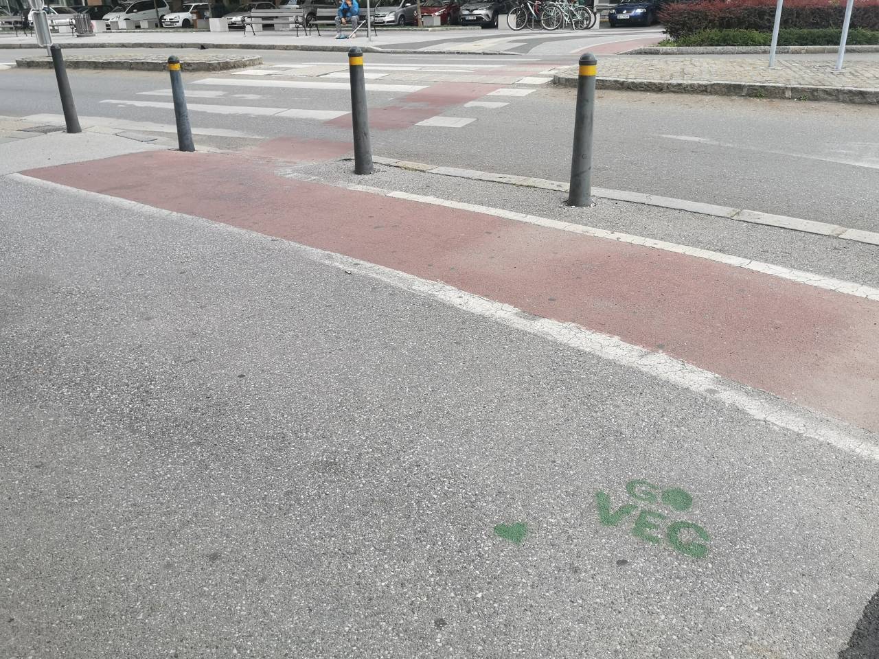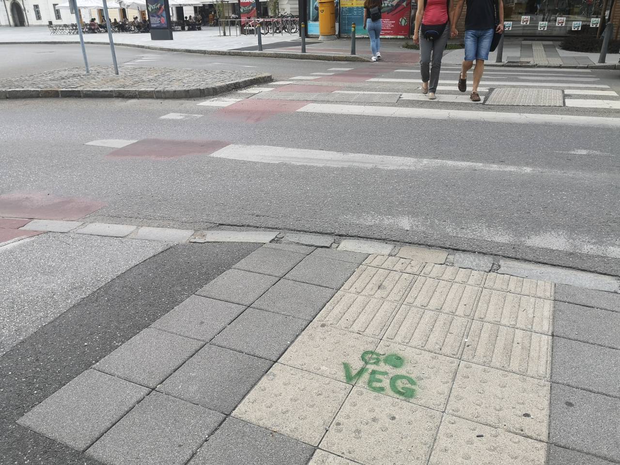 Grafit so pustili tudi na novih klopeh, ki so jih na prenovljenem Glavnem trgu postavili pred nekaj dnevi. Prav tako so grafitarji z zelenimi srčki 'počečkali' nove tlakovce na trgu. »Go veg« napis smo opazili tudi na vsaki strani prehoda za pešce ob krožišču na robu Glavnega trga.