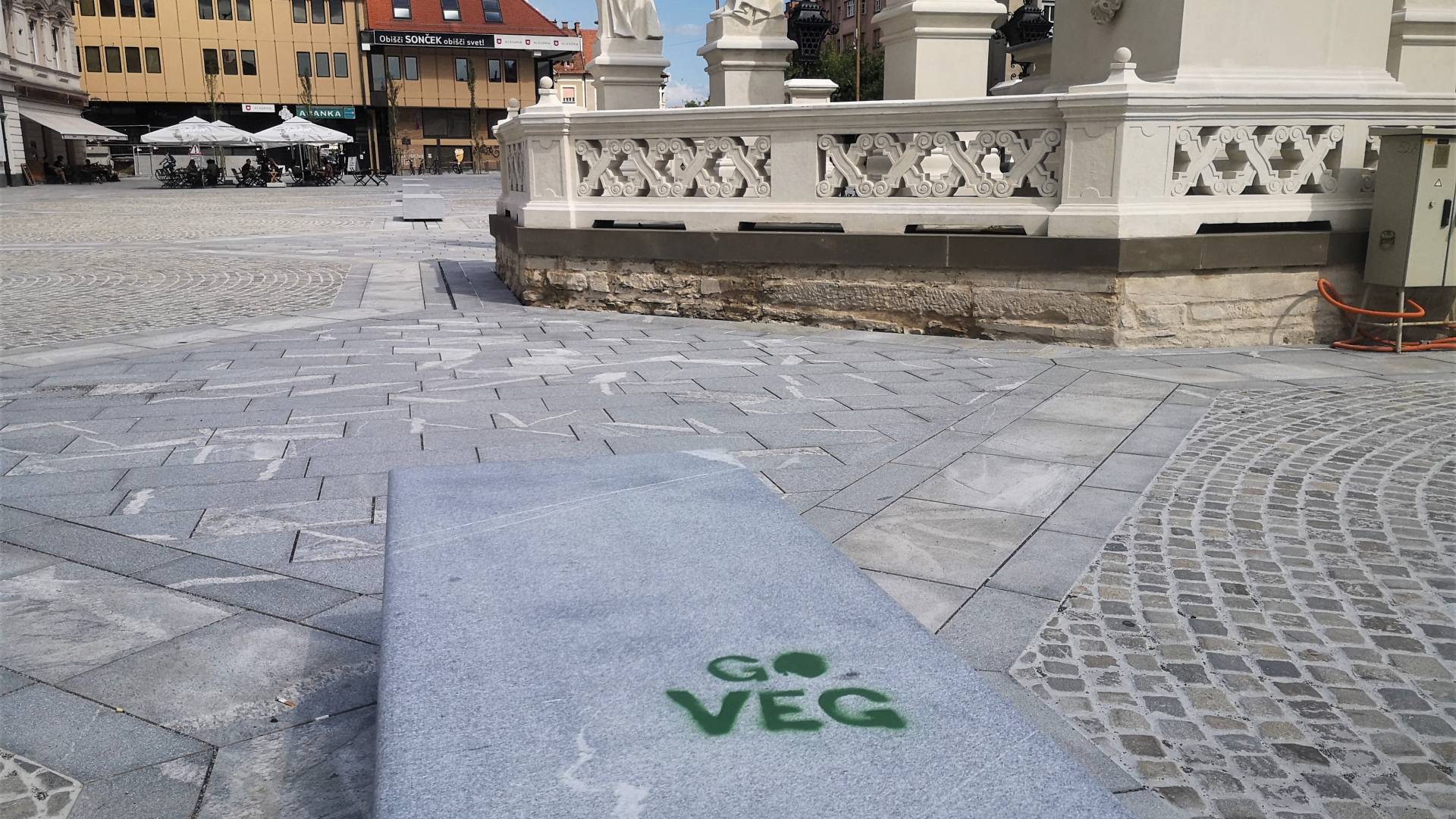 Po tem ko so grafitarji na steni najmanjšega slovenskega muzeja pustili napis »Go Veg«, se je enak grafit pojavil na novih klopeh na Glavnem trgu.