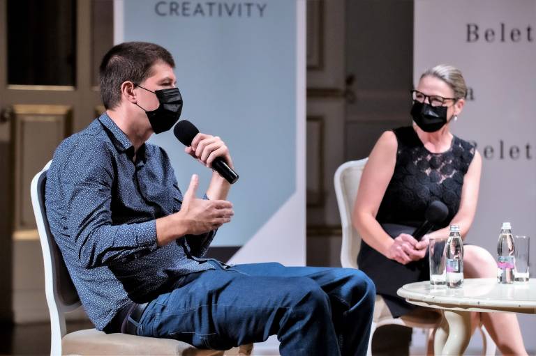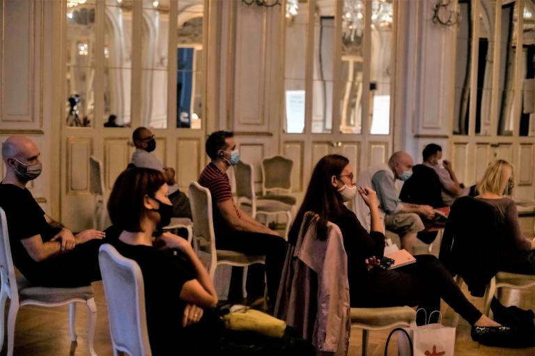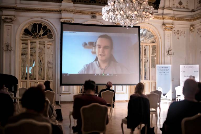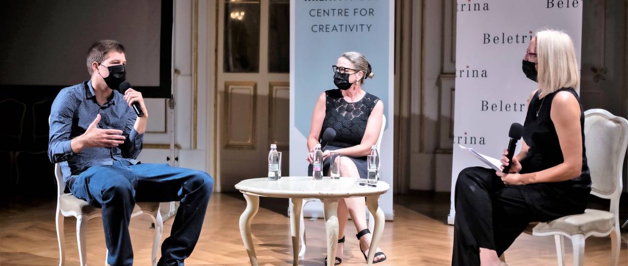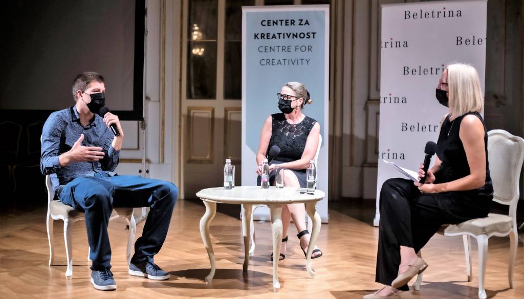 Bronja Žakelj in Goran Vojnović sta se voditeljici pogovora pridružila v dvorani, pogovora z gostoma iz tujine pa zaradi tehničnih težav ni bilo mogoče opraviti v celoti. V prihodnjih dneh bomo objavili videoposnetek pogovora, ki so ga posneli naknadno.