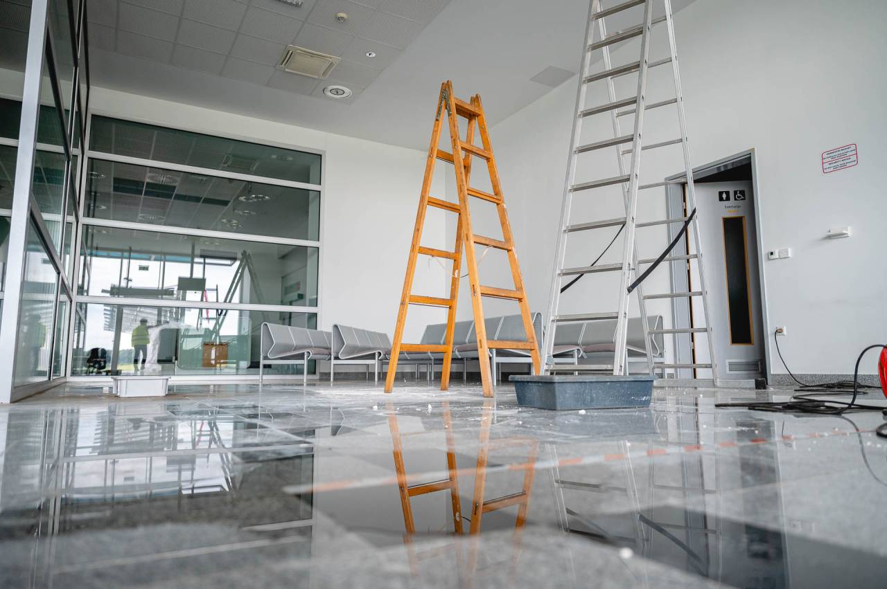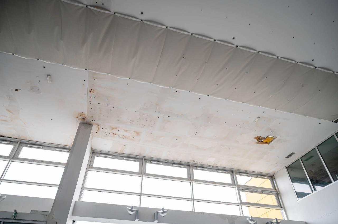 Močan dež in veter sta poškodovala streho, zalilo je prostore na več mestih odpada strop.