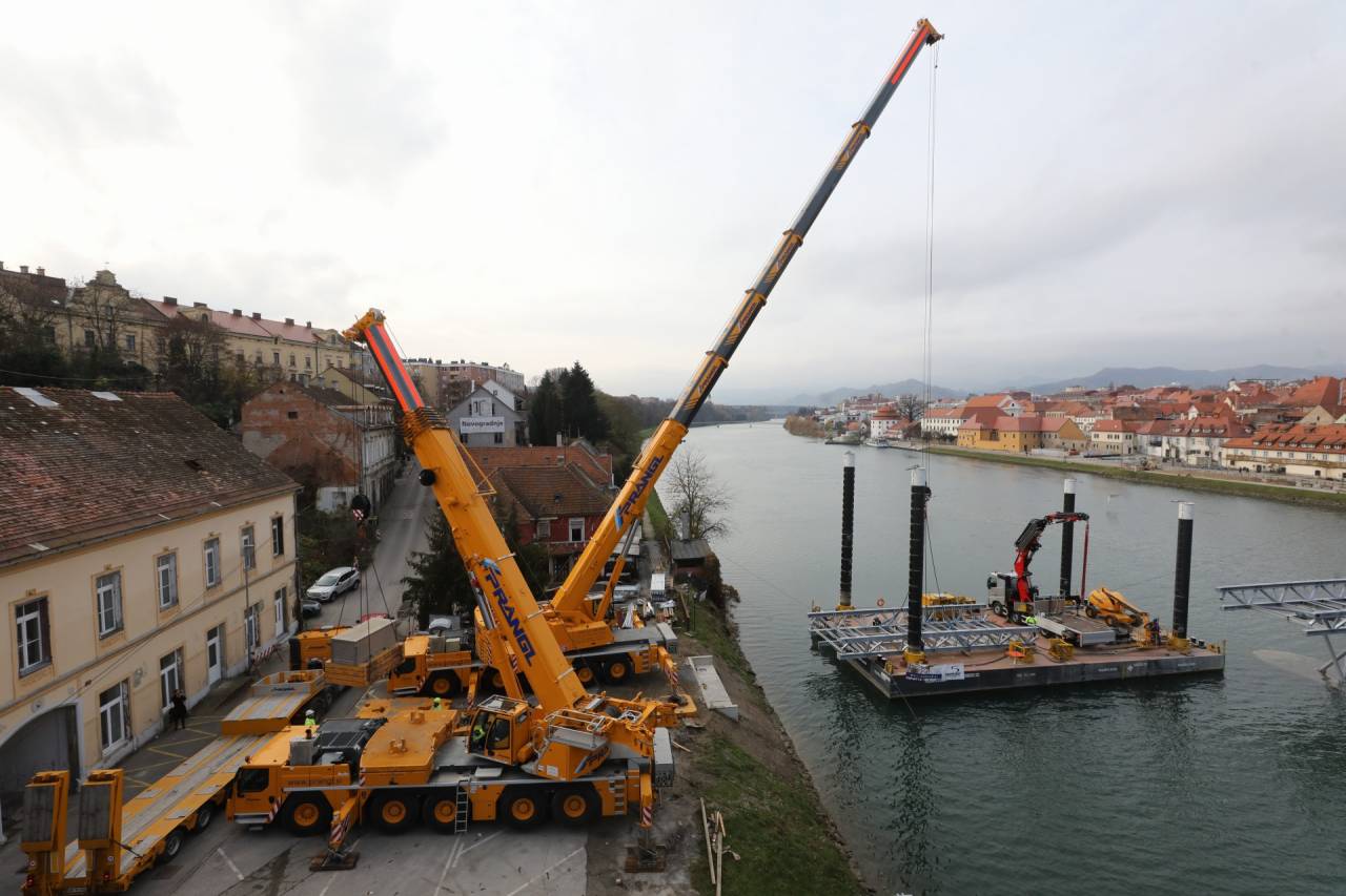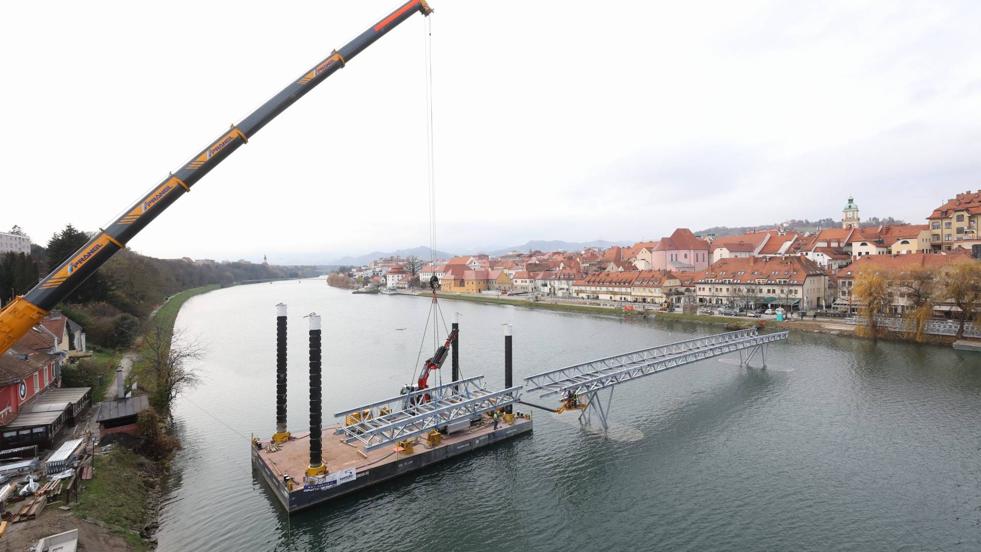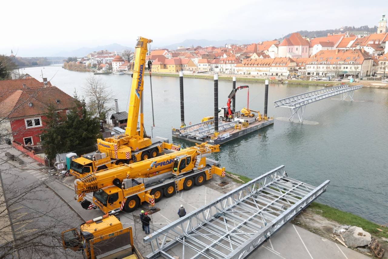 Včeraj so namreč začeli s postavljanjem okoli 40 ton težke jeklene konstrukcije, ki bo srednji del brvi povezala s Taborskim nabrežjem, danes pa nadaljujejo še na Lentu, ko bo brv dosegla še levi breg.