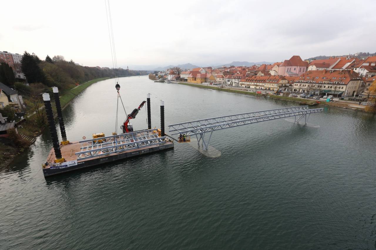 Dela pa na mariborskem Lentu hitro napredujejo, saj bi naj že danes nastajajoča brv dosegla oba bregova Drave ter s tem povezala Lent in spodnji del Tabora.
