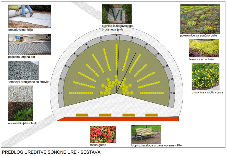 Ura bo imela premer 15 metrov. Številčnica bo oblikovana iz kovinskih številk, okoli nje pa bo urejeno nasutje s kamenčki. Večji del površine bo zasajen s cvetlicami in okrasnimi cvetočimi nizkimi grmički. Uredili bodo še krožno urejeno pot za sprehod in ogled ure ter postavili klop.