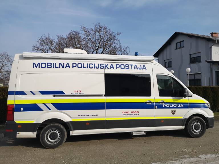 Veliko policijsko vozilo z napisom 'mobilna policijska postaja' zagledamo parkirano ob cesti. Njen osnovni namen pa je mimoidočim približati delo policistov.
