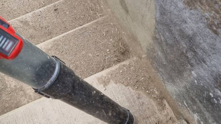 Po odstranitvi večjih kosov zemlje, ki so se nabrali v vogalih stopnic in iz katerih je že poganjala trava, je z različnimi orodji očistil vse 454 stopnic, od spodaj navzgor.