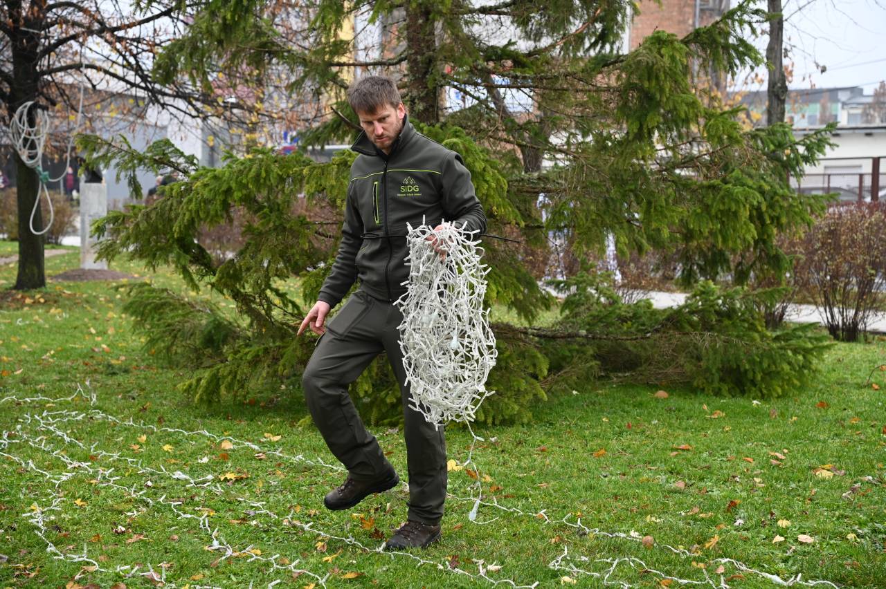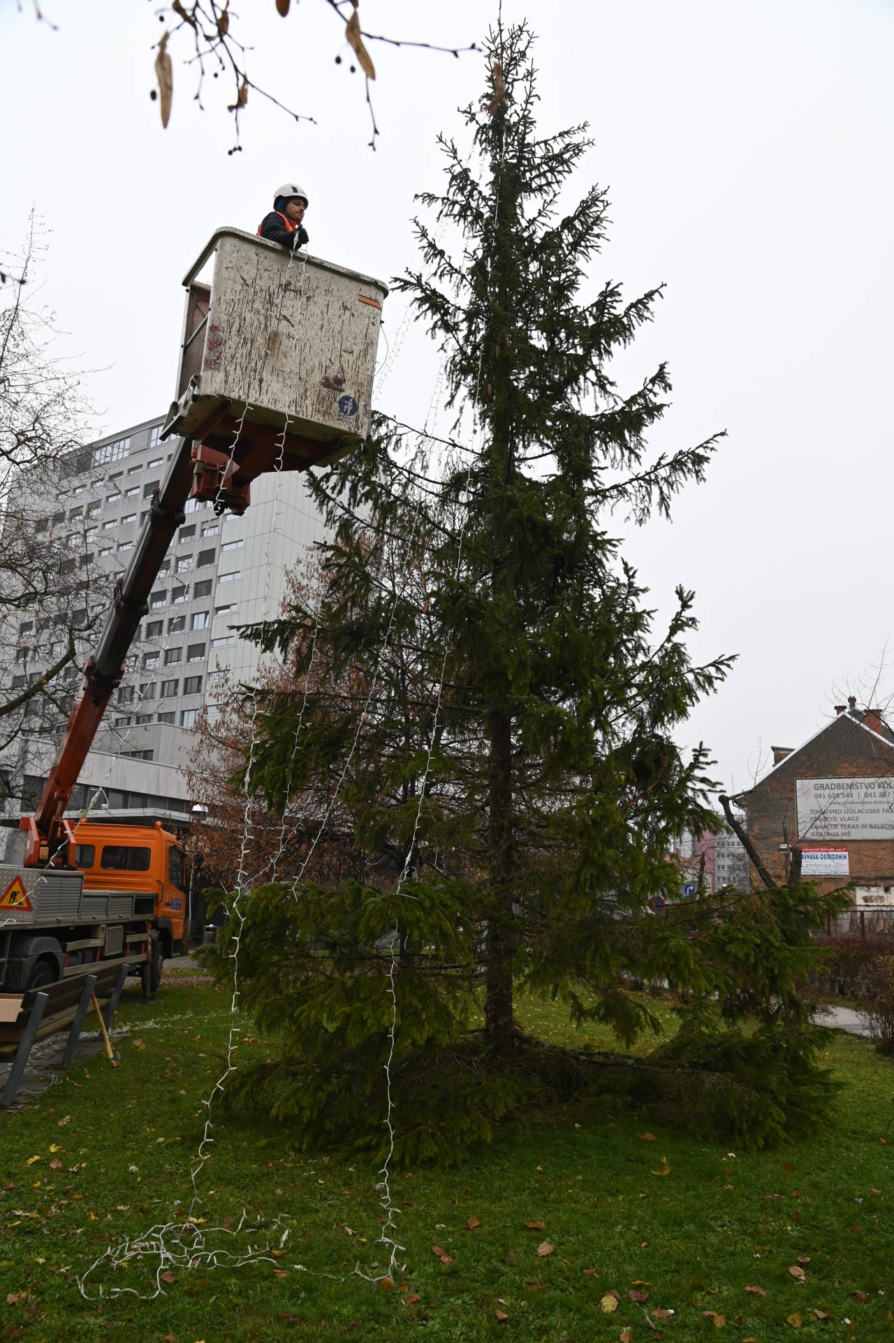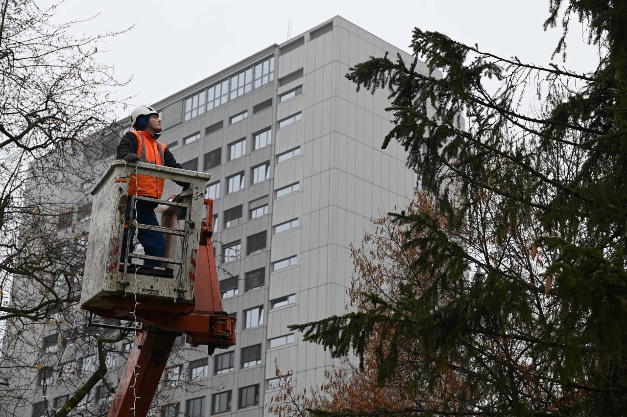 Veliko božično drevo so v dopoldanskih urah iz Oplotnice prepeljali do Univerzitetnega kliničnega centra Maribor, sledila je postavitev in okrasitev.