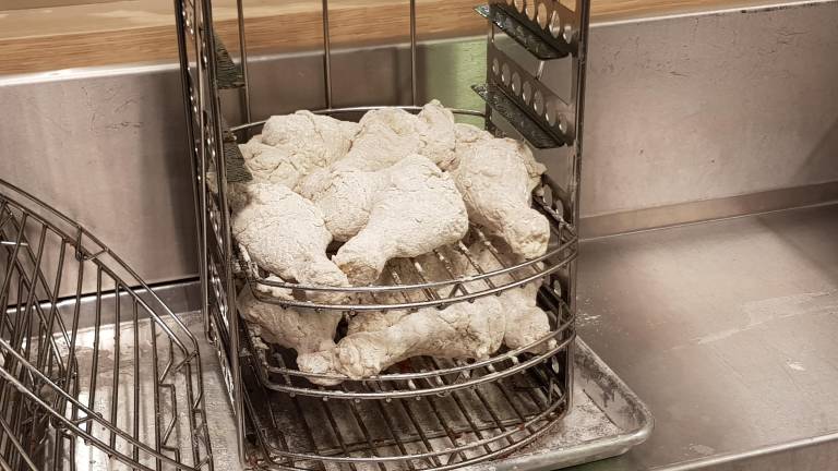 Piščančje meso dobavljajo v restavracije 2- do 3-krat tedensko, nato ga, kot smo se lahko prepričali, lastnoročno panirajo in pripravijo v restavracijski kuhinji. Sledila je le še degustacija hrustljavega piščanca, postreženega v ikonični KFC Košari. Recept za KFC piščanca temelji na 70 let starem originalnem receptu.