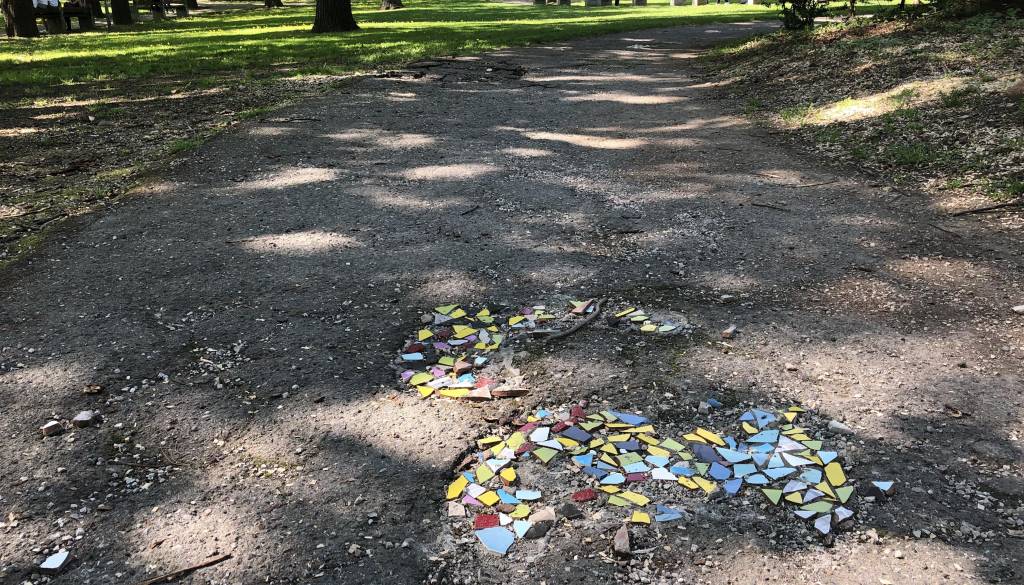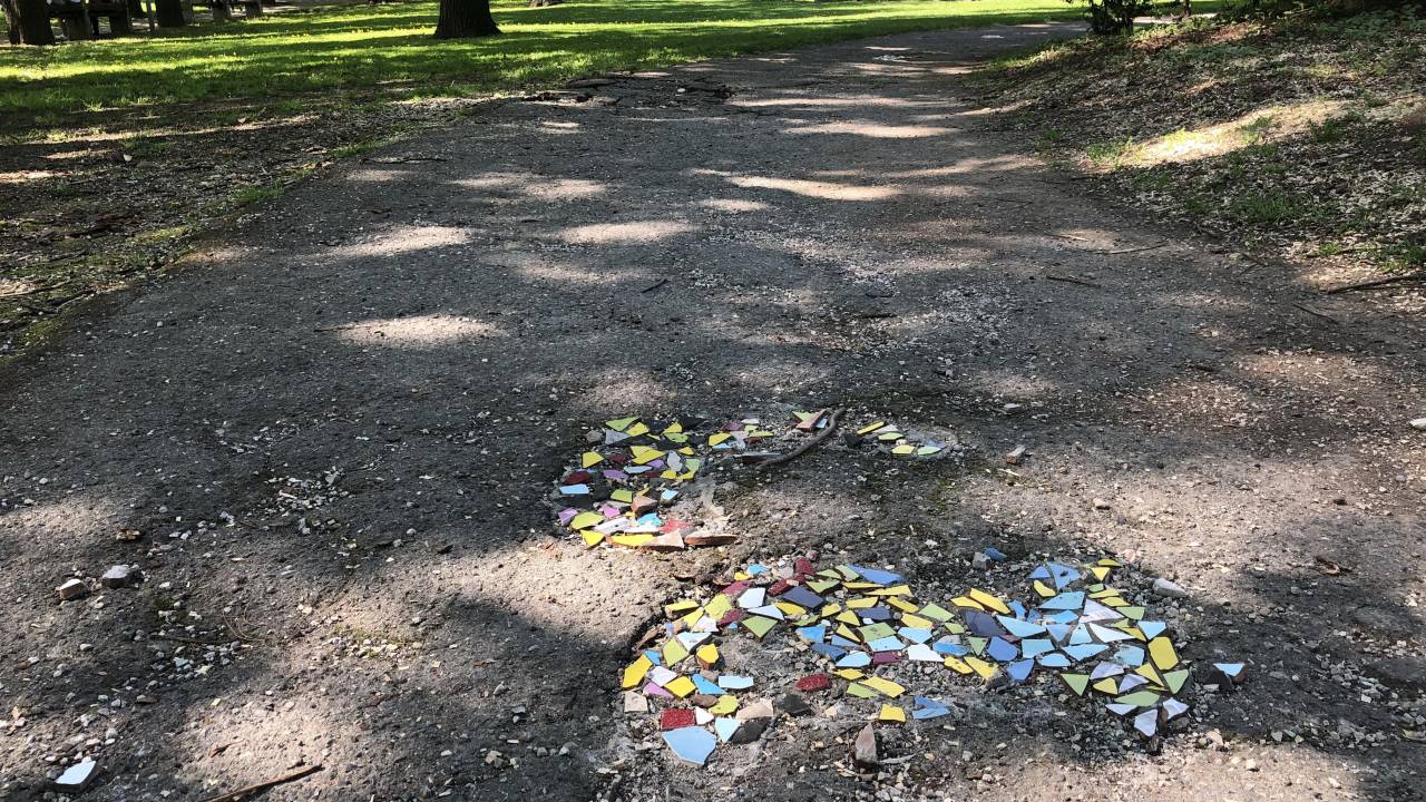 Prostovoljci so dotrajane poti uredili s pomočjo odpadnih barvitih ploščic, betonske mase in grafitov.