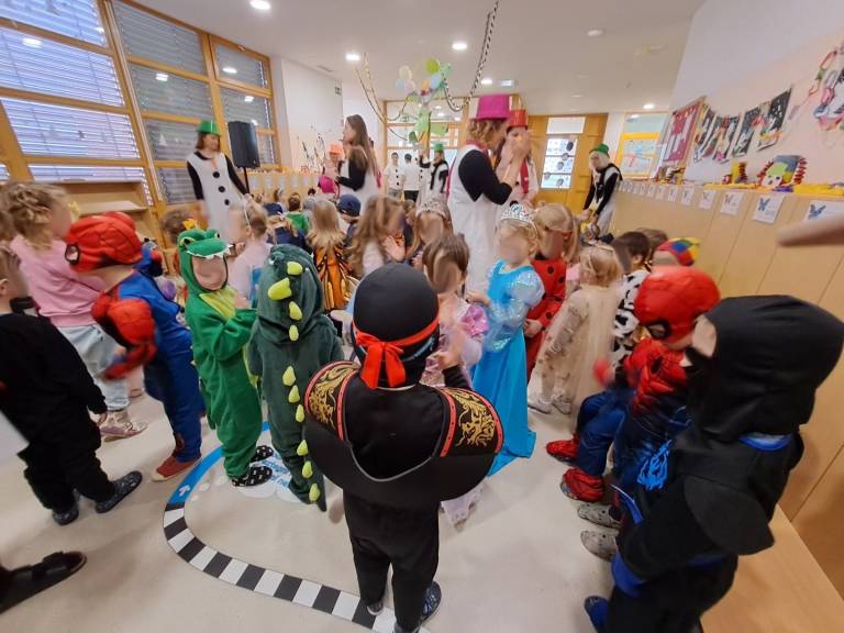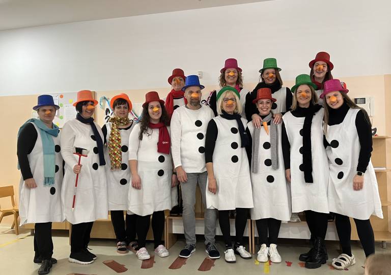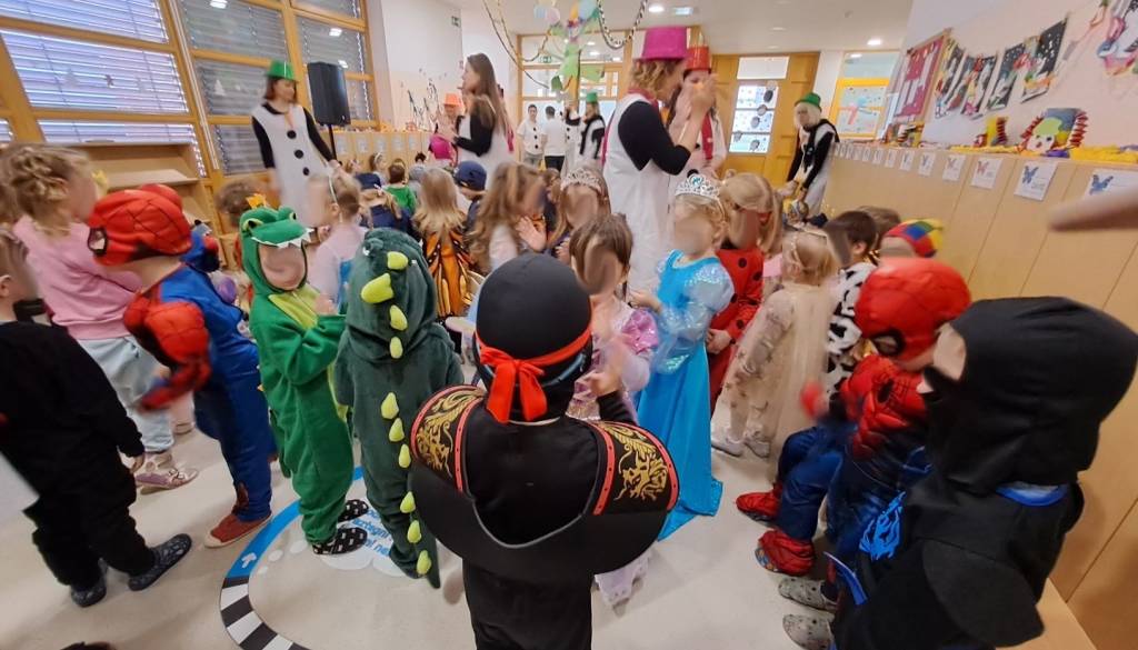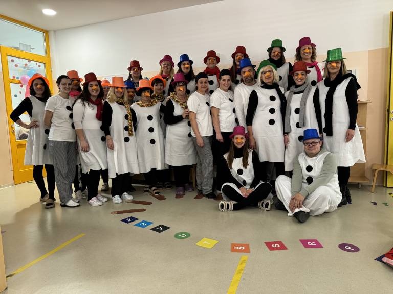 Norčavi pustni teden so zaključili s pustim rajanjem na hodniku vrtca in s skupinsko masko vseh zaposlenih, ki so se za en dan prelevili v snežake.