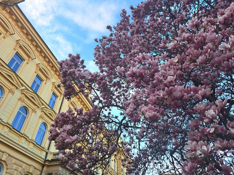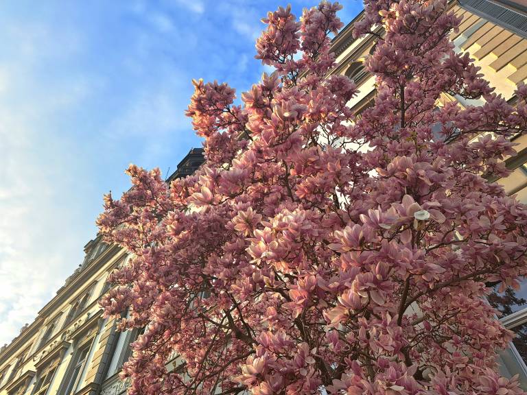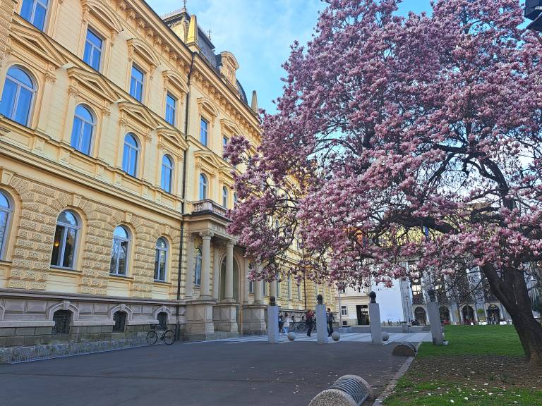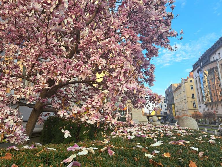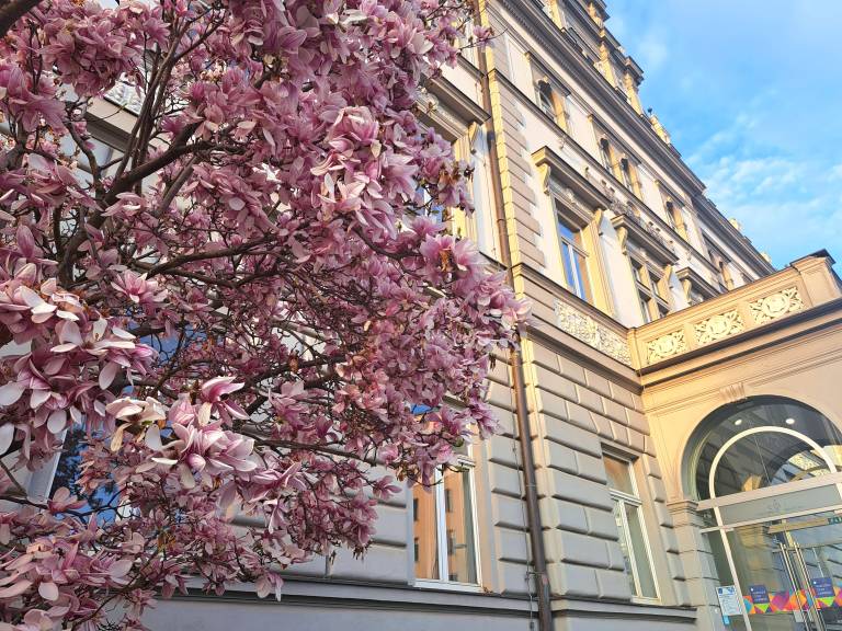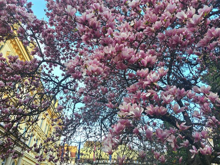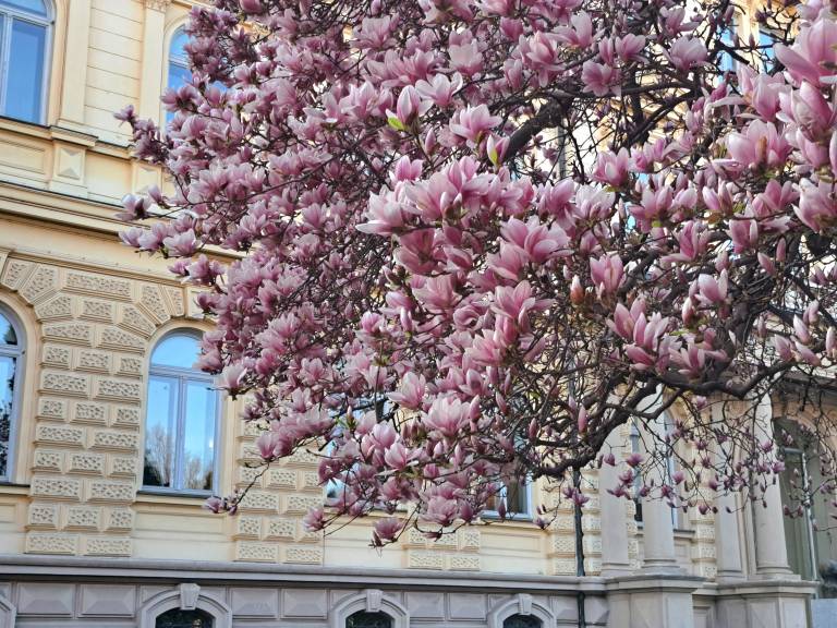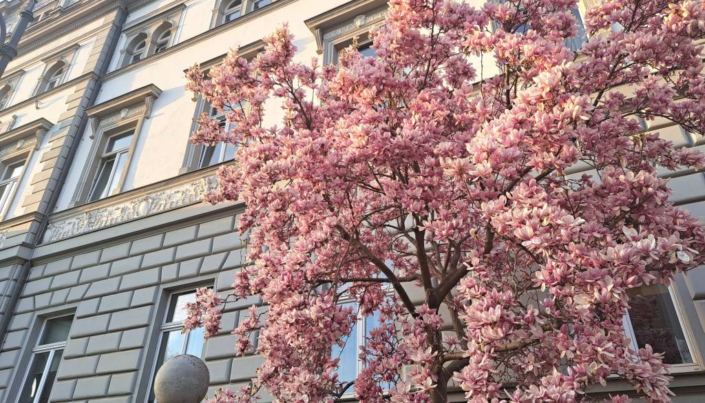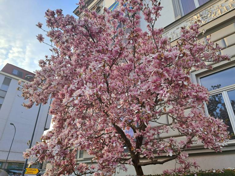 Očarljiva magnolija se z velikimi cvetovi bohoti pred Univerzo v Mariboru. Prav tako poglede mimoidočih privabljata cvetoči magnoliji pred Narodnim domom Maribor.