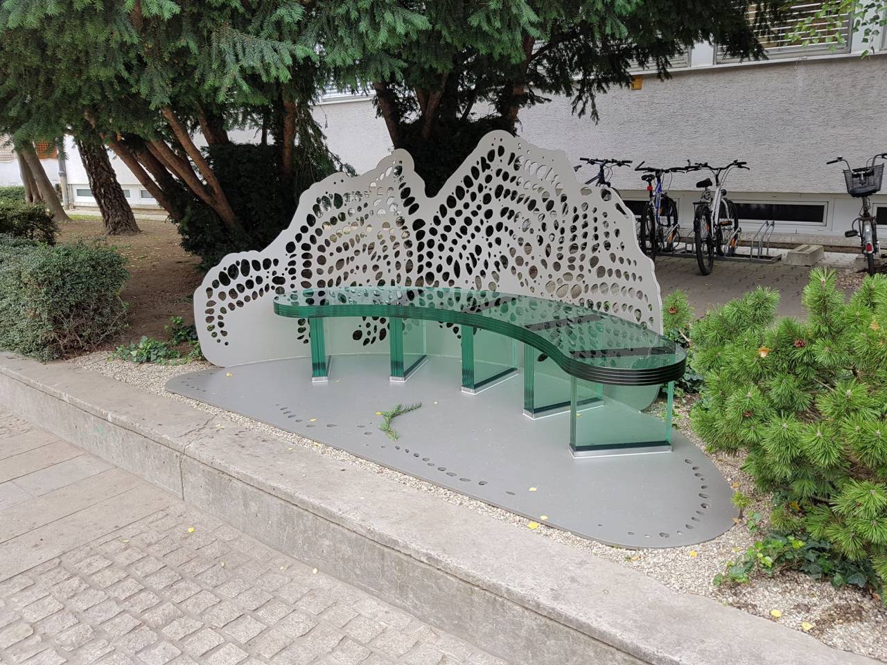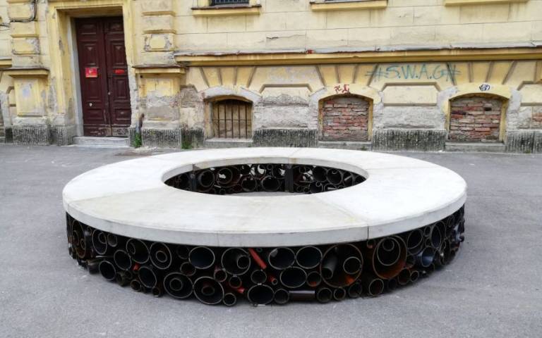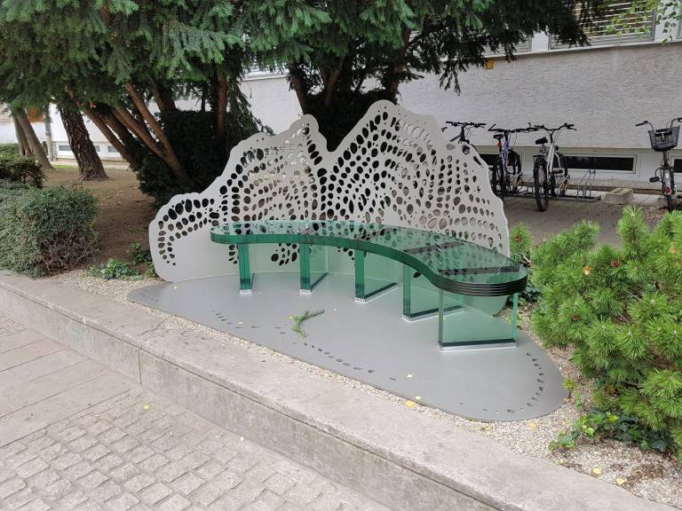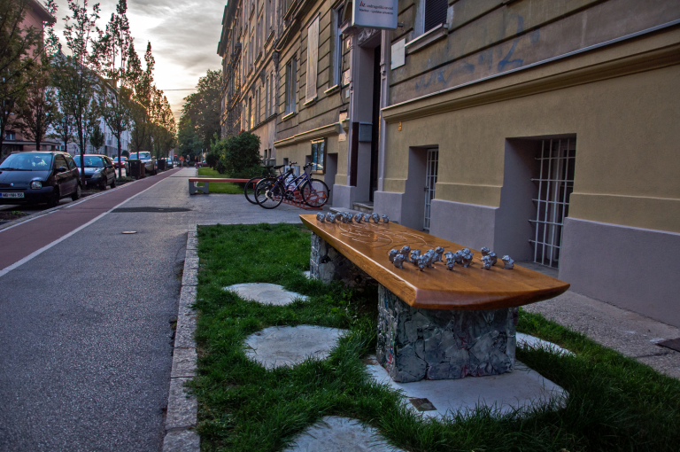 Umetniška klop se odziva na stavbo in njeno zgodbo. Njena forma ni naključje. Ponazarja težko zgodovinsko vsebino in žalostno propadanje stavbe ter obenem začetek njenega preporoda.