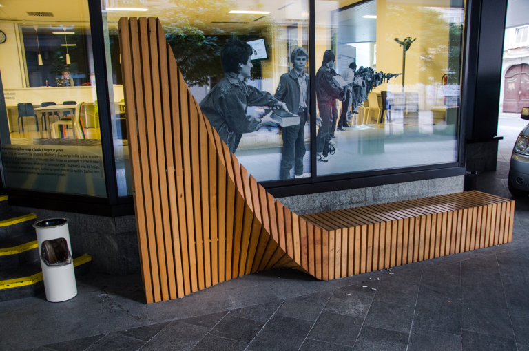 Prva klop »Izmenjava knjig - Živa veriga« je delo Nejca Brezovška in nahaja se pred Univerzitetno knjižnico Maribor.