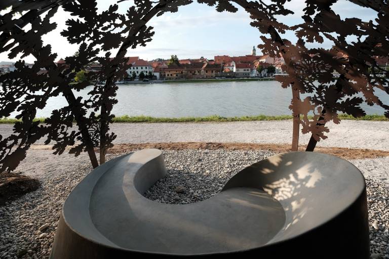 Umetniška klop »Trenutek«, ki je avtorsko delo akademske kiparke Vlaste Čobal Sedmak, stoji na nabrežju reke Drave.