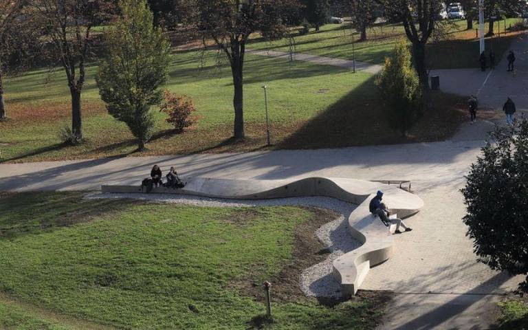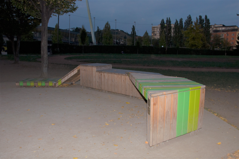 »Speči velikan« se prebuja z novimi vsebinami in boljšimi zgodbami. Klop je oblikovno zasnovana iz dveh delov. Podstavek, izdelan iz ponovno uporabljenih kovinskih cevi različnih dimenzij, simbolizira težo zgodbe stavbe in njeno preteklost, svetla sedežna površina iz gladkega betona pa ponazarja njeno prihodnost in nov začetek oživljanja stavbe ter območja.