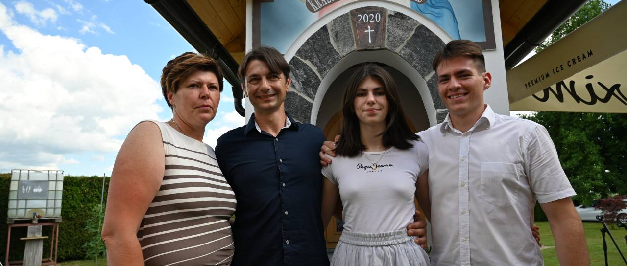 Štiričlanska družina Pihlar, ki prihaja iz Mote pri Ljutomeru se je na domačem dvorišču odločila postaviti novo kapelico v zahvalo za rojstvo otrok Dominika in Anamarije.