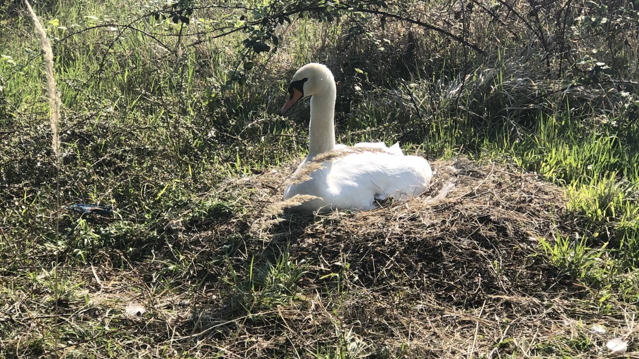 Nedaleč od lanske lokacije, ampak na drugi strani ceste, si je zaljubljen labodji par tudi letos postavil gnezdo, ki so ga domačini za zaščito ogradili z balami slame.