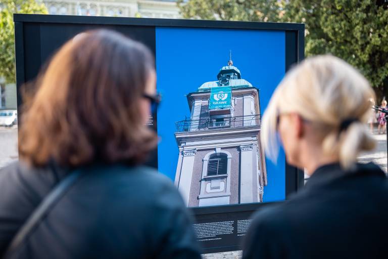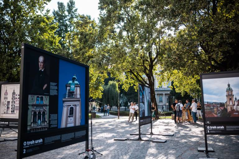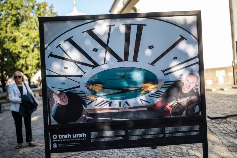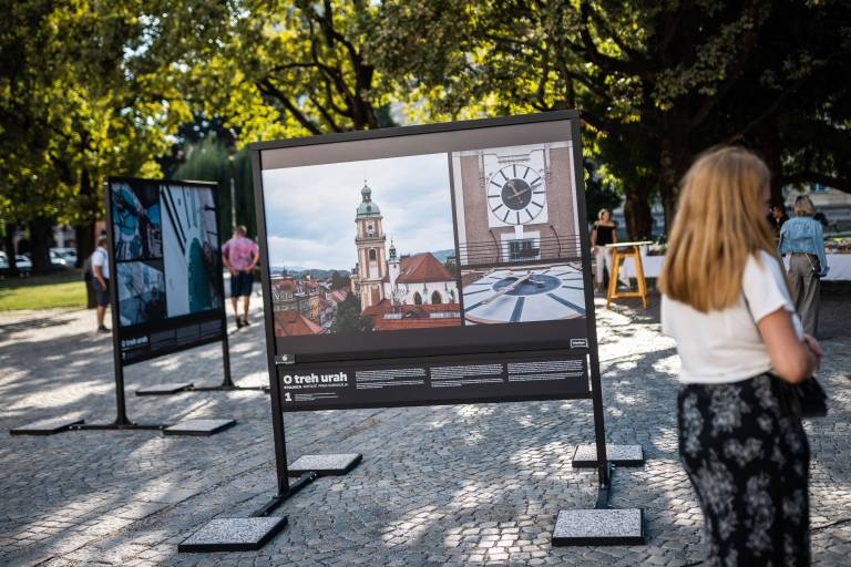 'Mestna urarja' Aleš Lombergar in Gorazd Šifrer vabita na razstavo 'O treh urah'. Ta krasi tri mariborske trge, in sicer si jo je mogoče ogledati na Glavnem, Slomškovem in Trgu generala Maistra.
