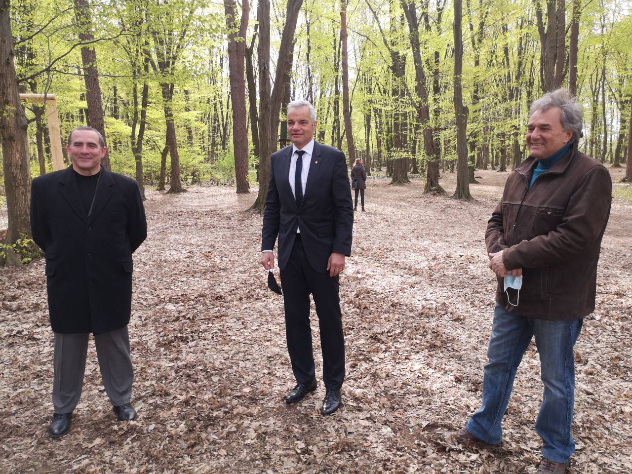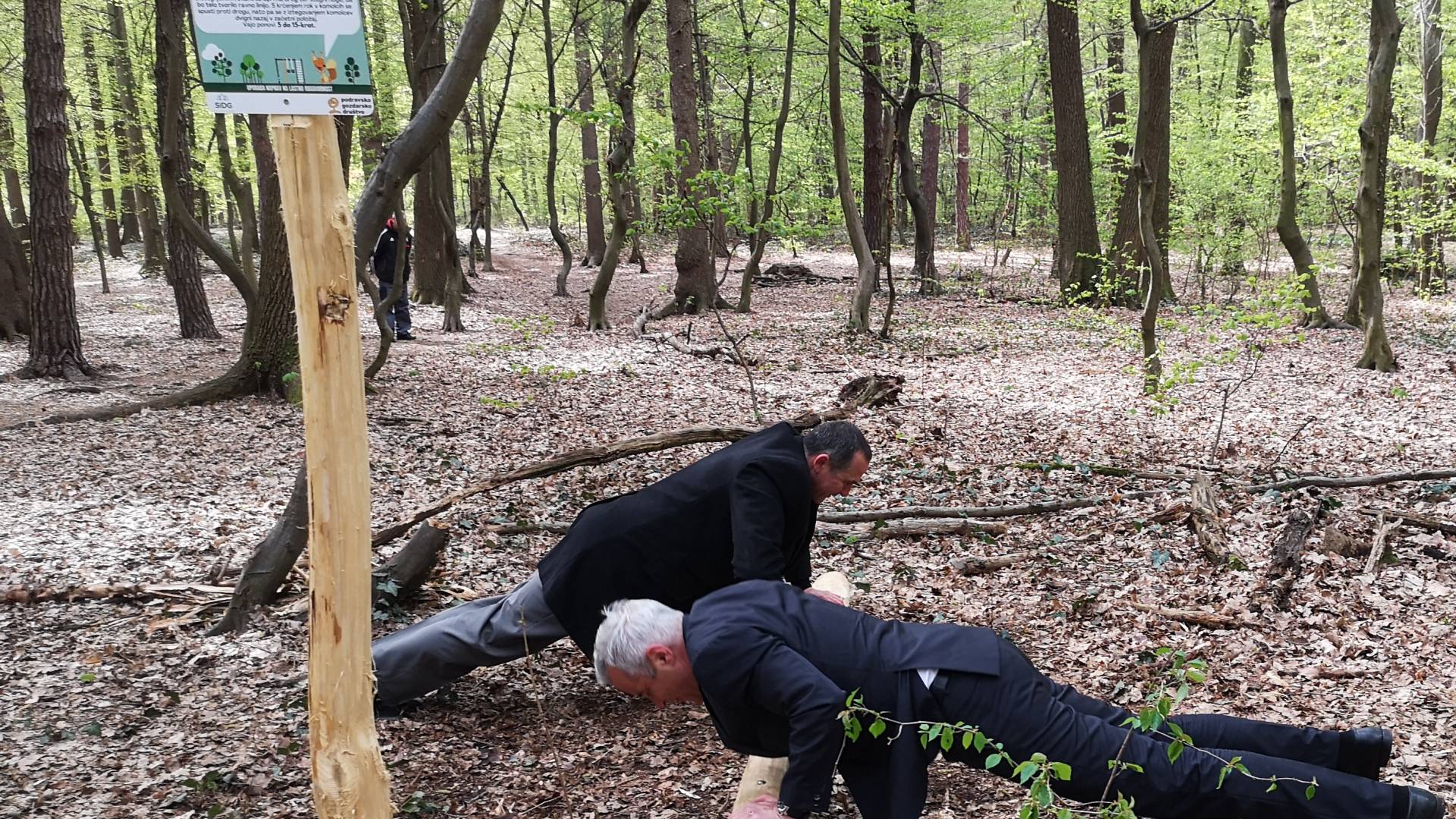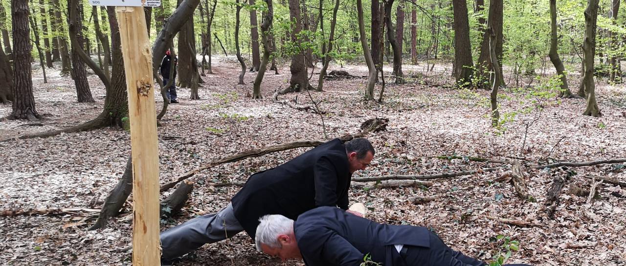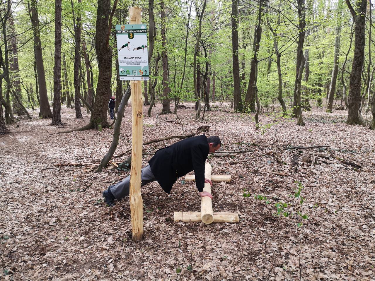 Direktor Slovenskih državnih gozdov in župan sta za trenutek preizkusila eno izmed točk nove trim steze, kjer sta sočasno naredila tri sklece. Oba poudarjata, da gre za pomembno pridobitev za Maribor.