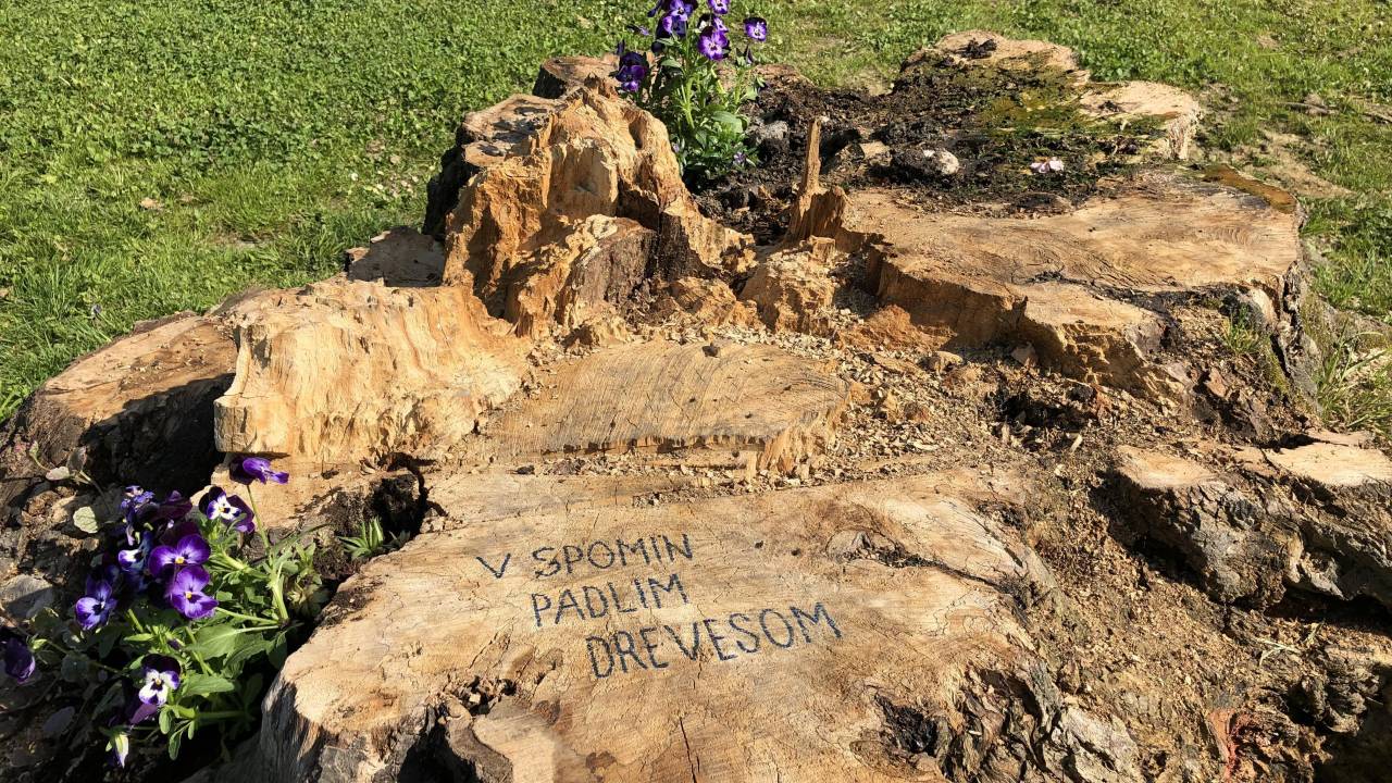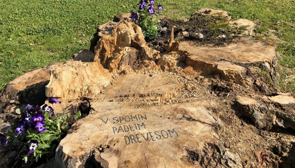 Na sprehodu skozi mestni park smo opazili, da so neznani aktivisti enega izmed štorov umetniško okrasili. Nanj so zasadili več rožic in dodali napis »V spomin padlim drevesom«.