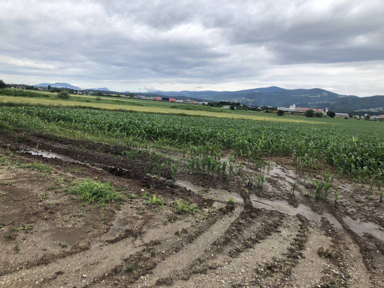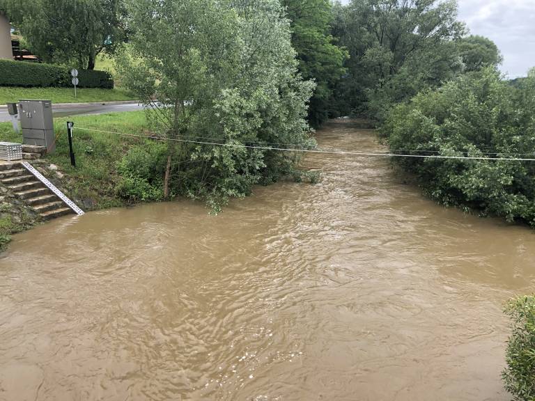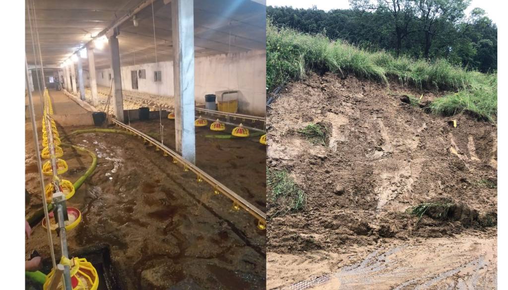 Meteorne vode so včeraj zalivale hiše, ceste, polja in travnike, v Spodnji Novi vasi, v občini Slovenska Bistrica, pa je voda zalila tudi piščančjo farmo.