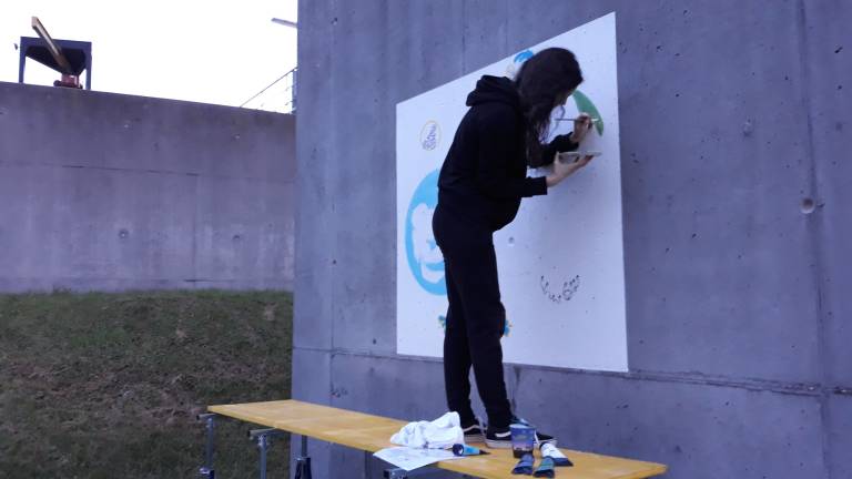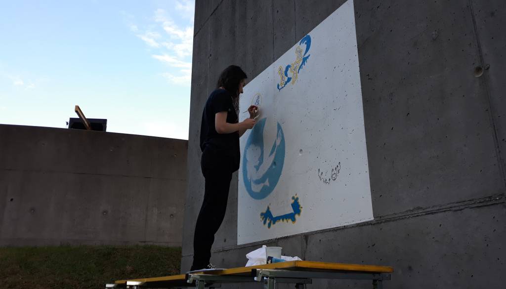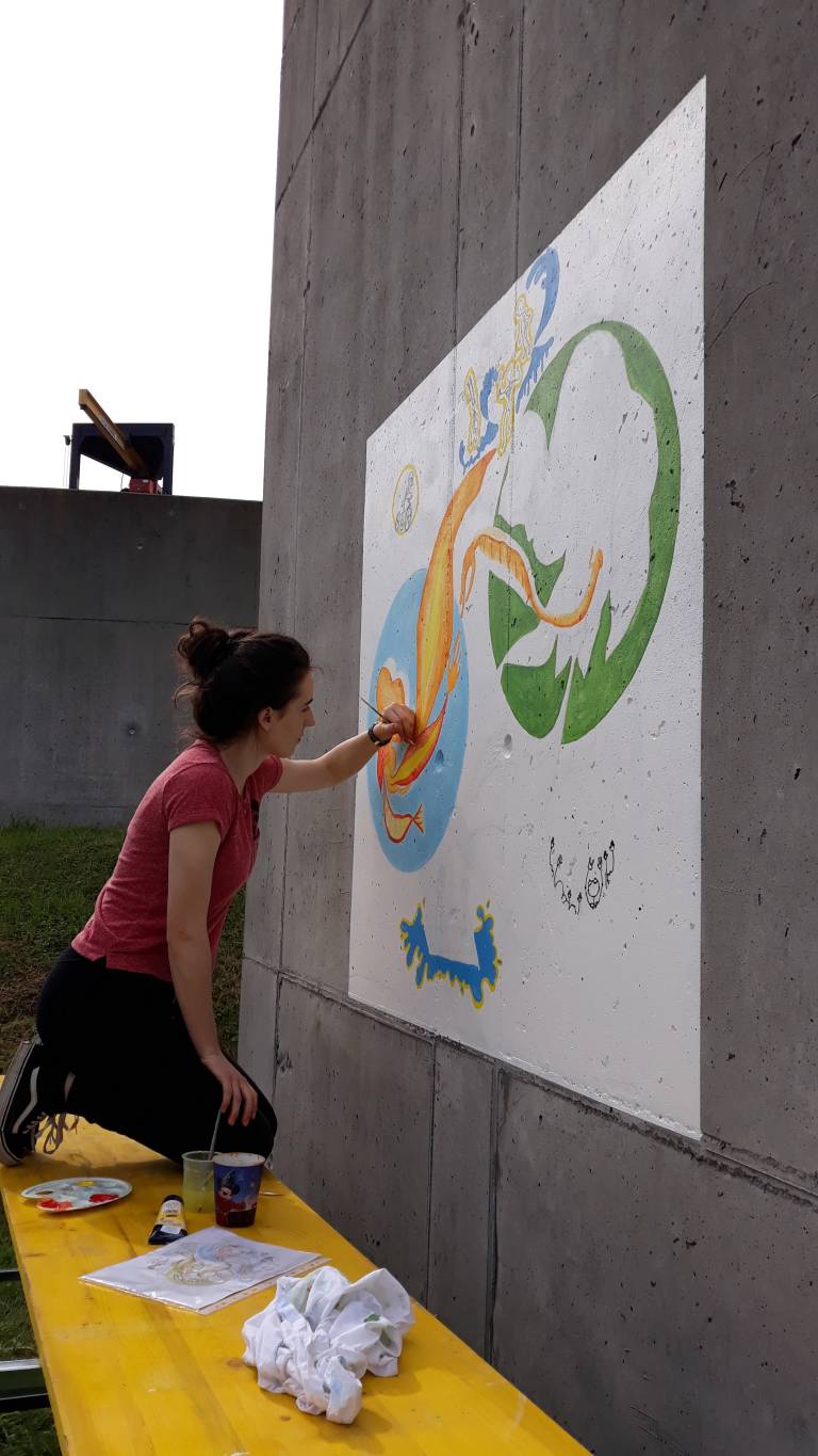 Lea je na steni Centralne čistilne naprave Maribor ustvarjala tudi med koncem tedna vse od jutra do večernih ur, njena zagnanost pa je navdušujoča.