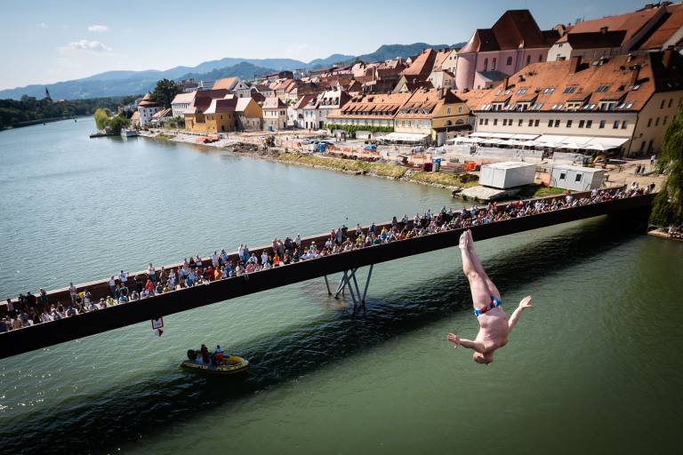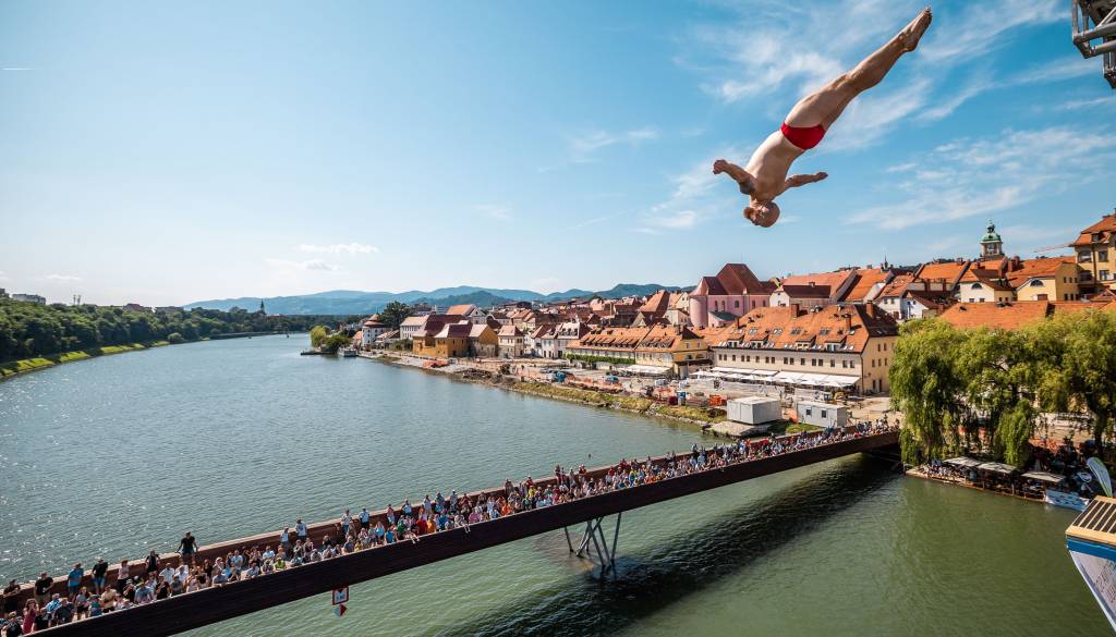 Dogajanje v Mariboru so danes popestrili pogumni akrobati, ki so v okviru že 23. mednarodnega tekmovanja skakali iz Glavnega mostu v Dravo.