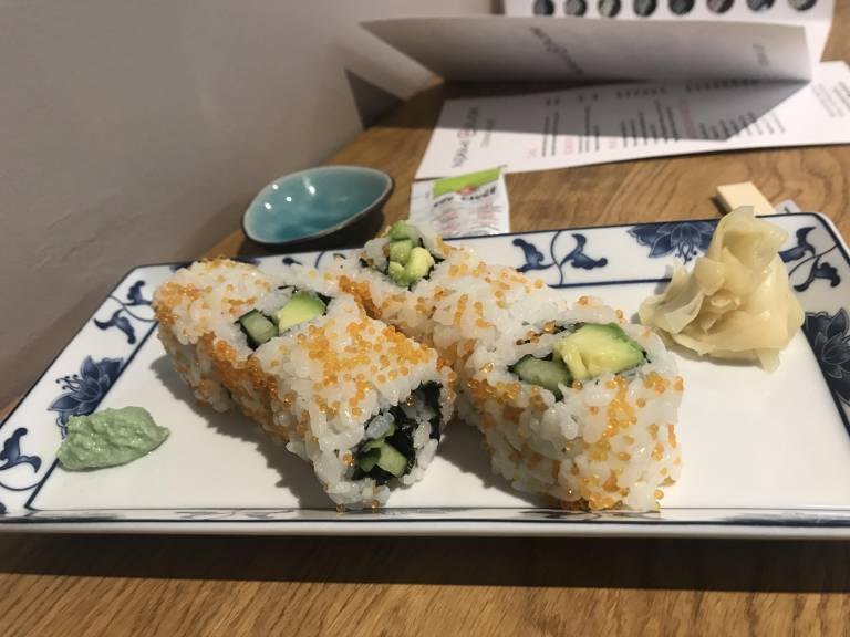 Pripravil nam je Kalifornija ikre - sredica iz avokada, kumare in nori alge, rolica je potresena z ikrami morskih lastovic in praženim sezamom.