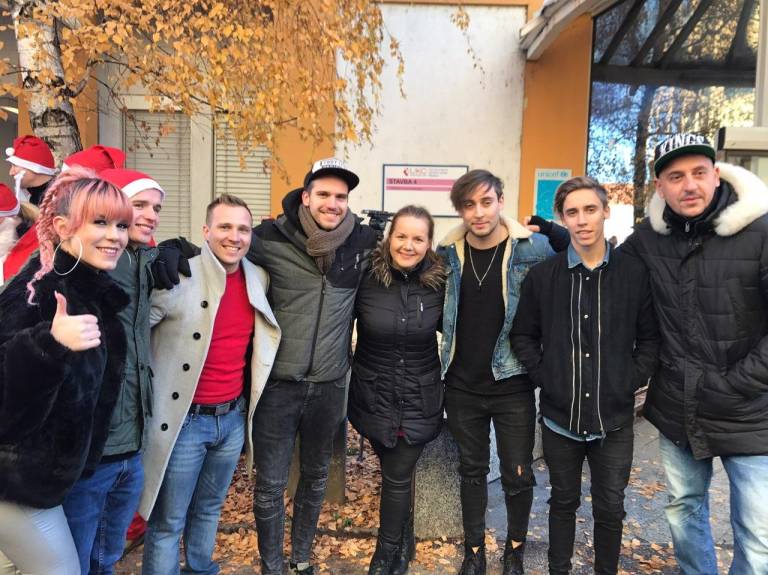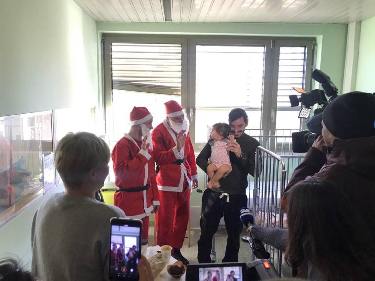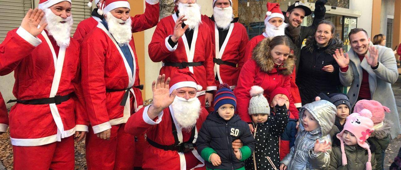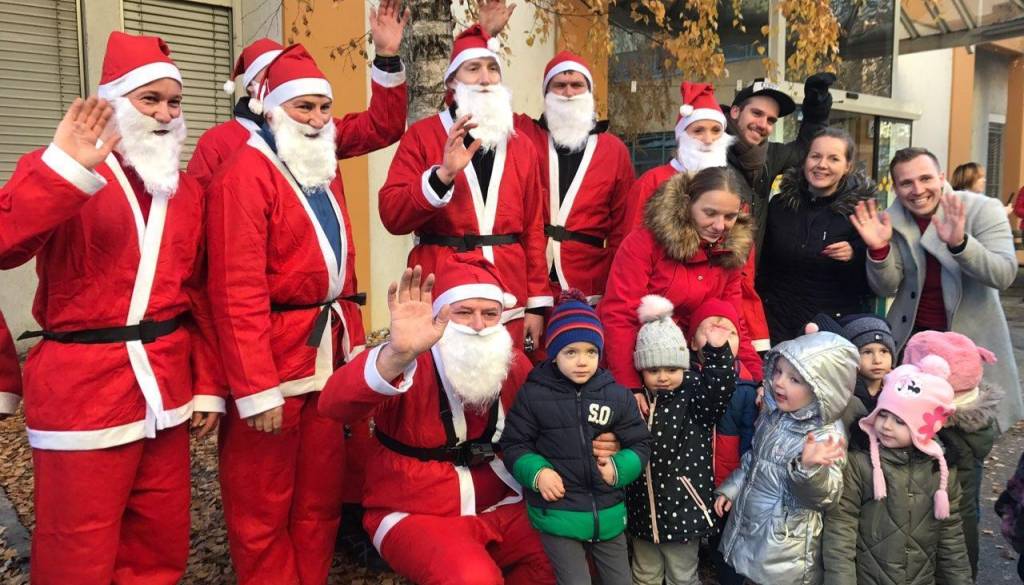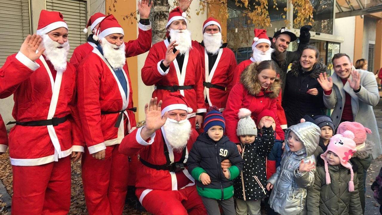 Reševalci Jamarsko reševalnega društva so se prelevili v dobre može, spodaj pa so jih pričakali mimoidoči in nekateri znani Slovenci, ki so se nato skupaj z njimi podali v bolnišnico, kjer so obdarili otroke ter z njimi tudi zapeli.