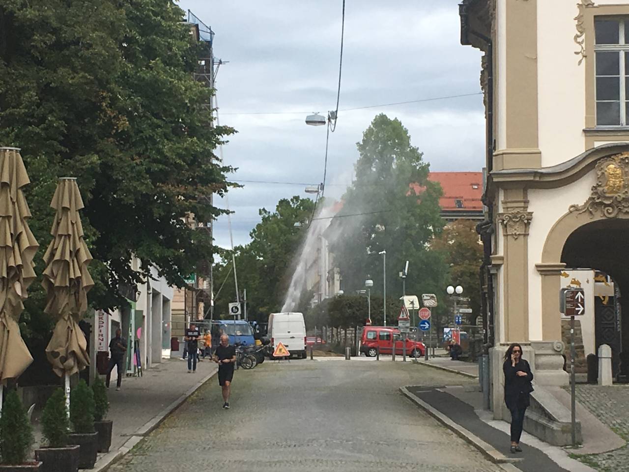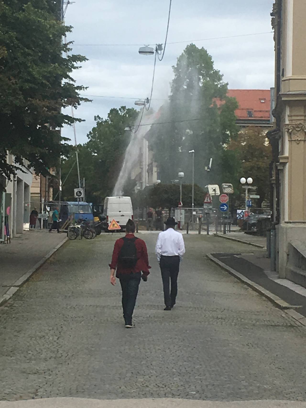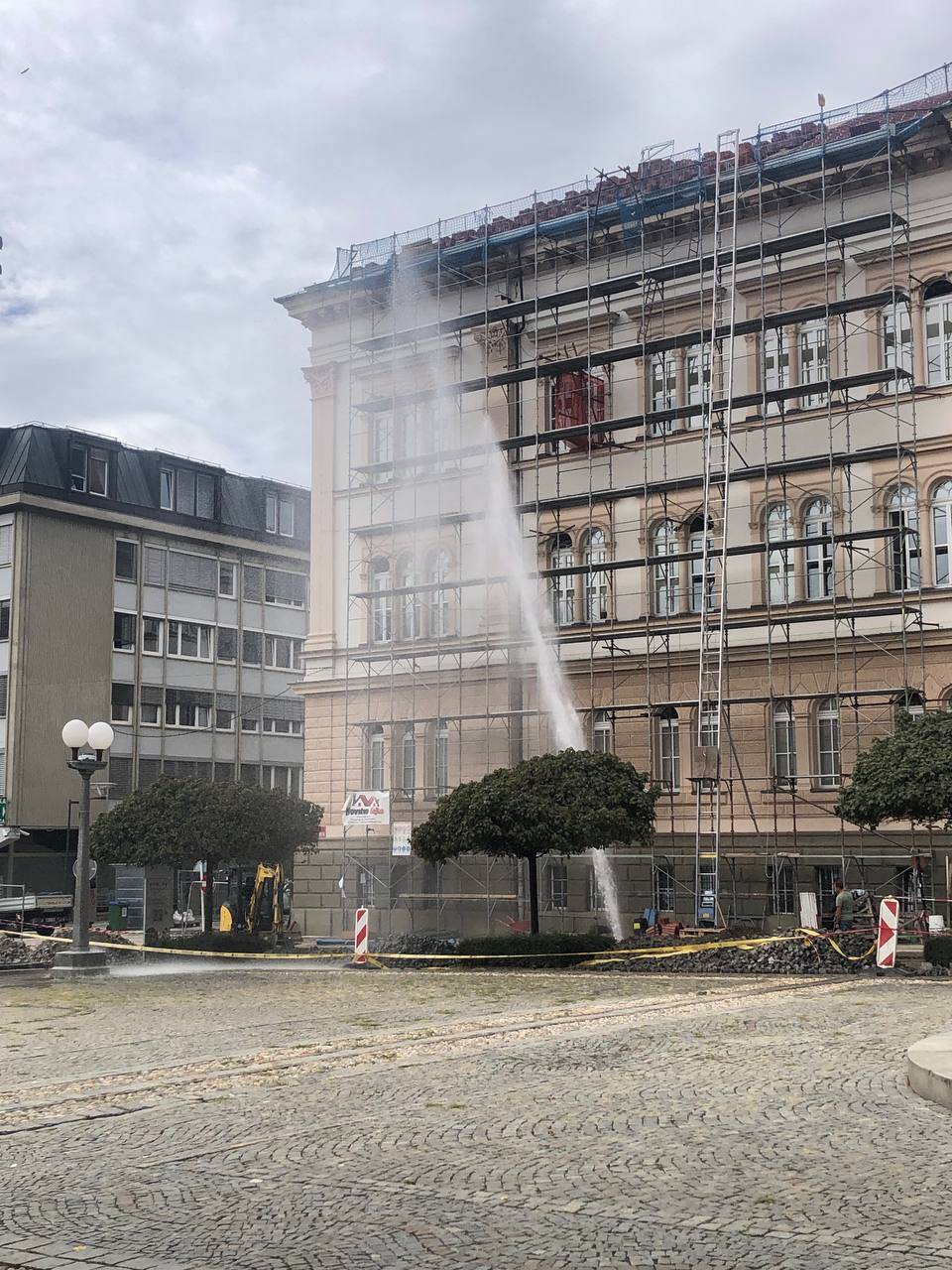 V središču Maribora je okoli poldneva med deli prišlo do predrtja vodovodne cevi, zaradi česar je voda brizgala več metrov v zrak.