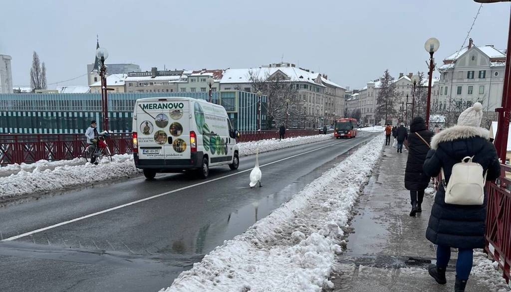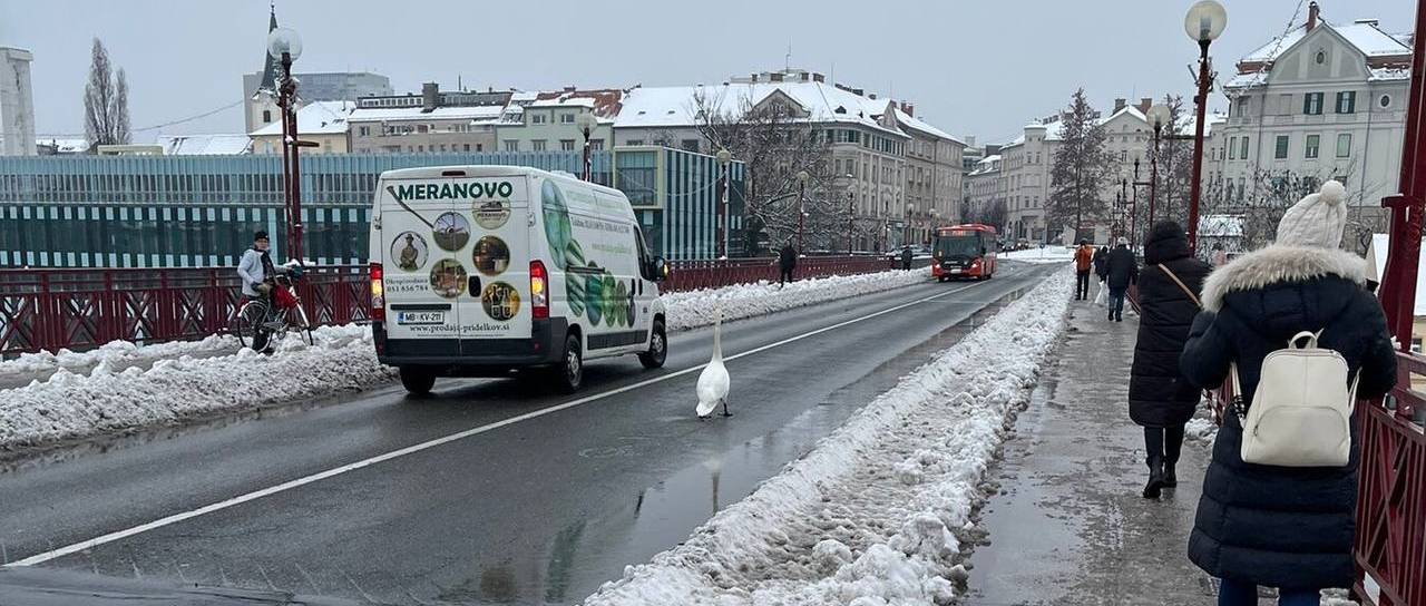 Kakšen šef! Labod z ležernim pohajkovanjem po cesti zaprl mariborski Stari most.
