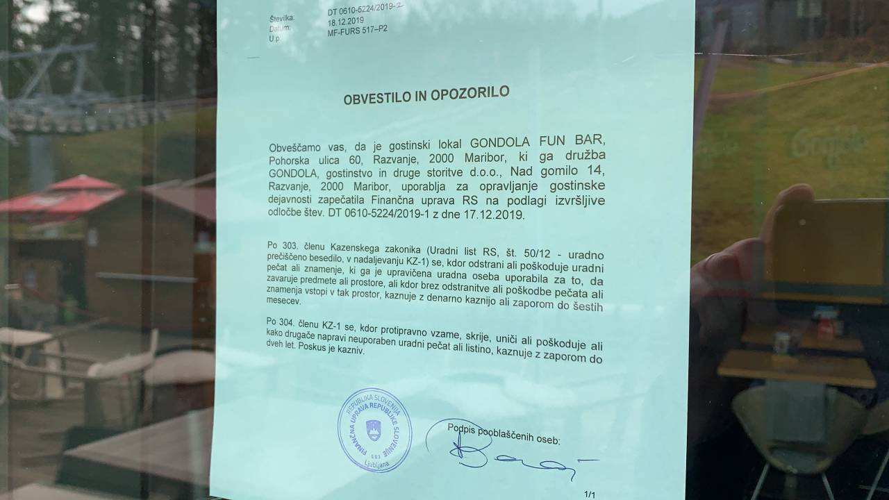 Gostinski lokal Gondola Fun Bar, ki ga je upravljala družba Gondola, gostinstvo in druge storitve, je Finančna uprava Republike Slovenije v sredo zapečatila.