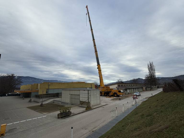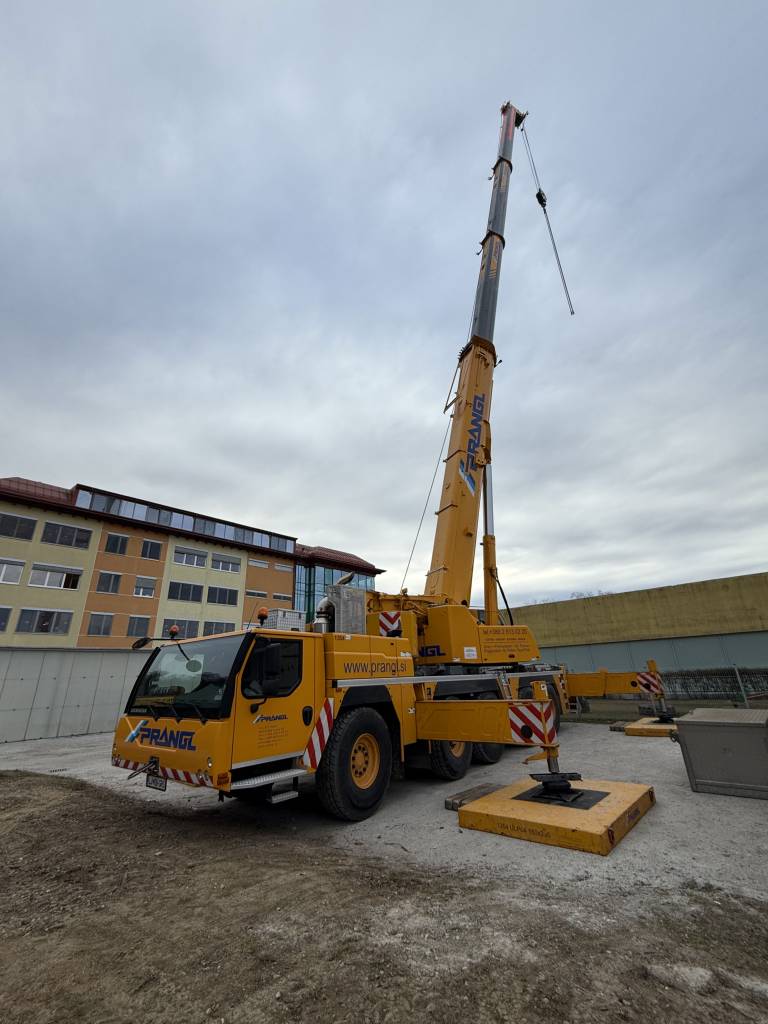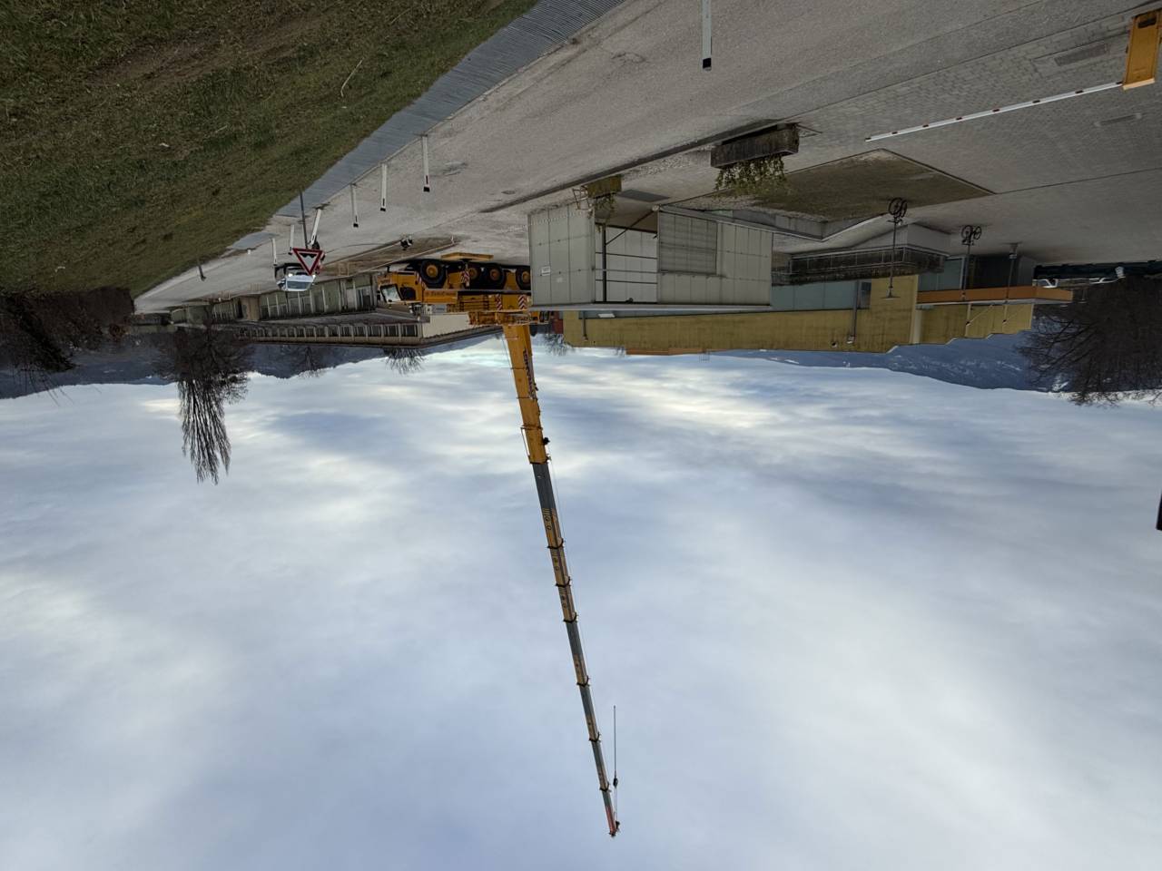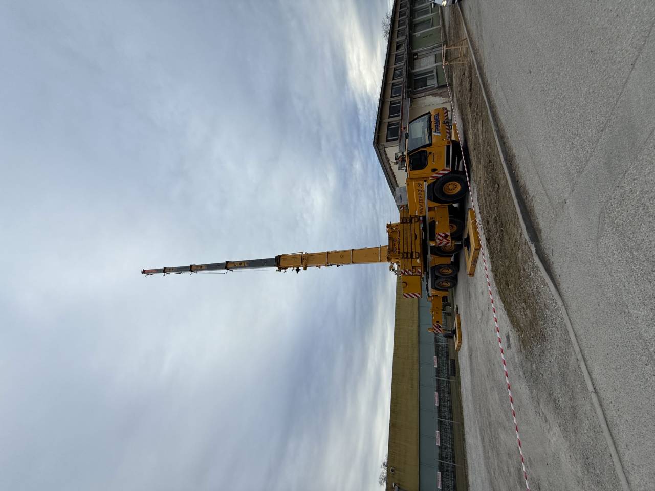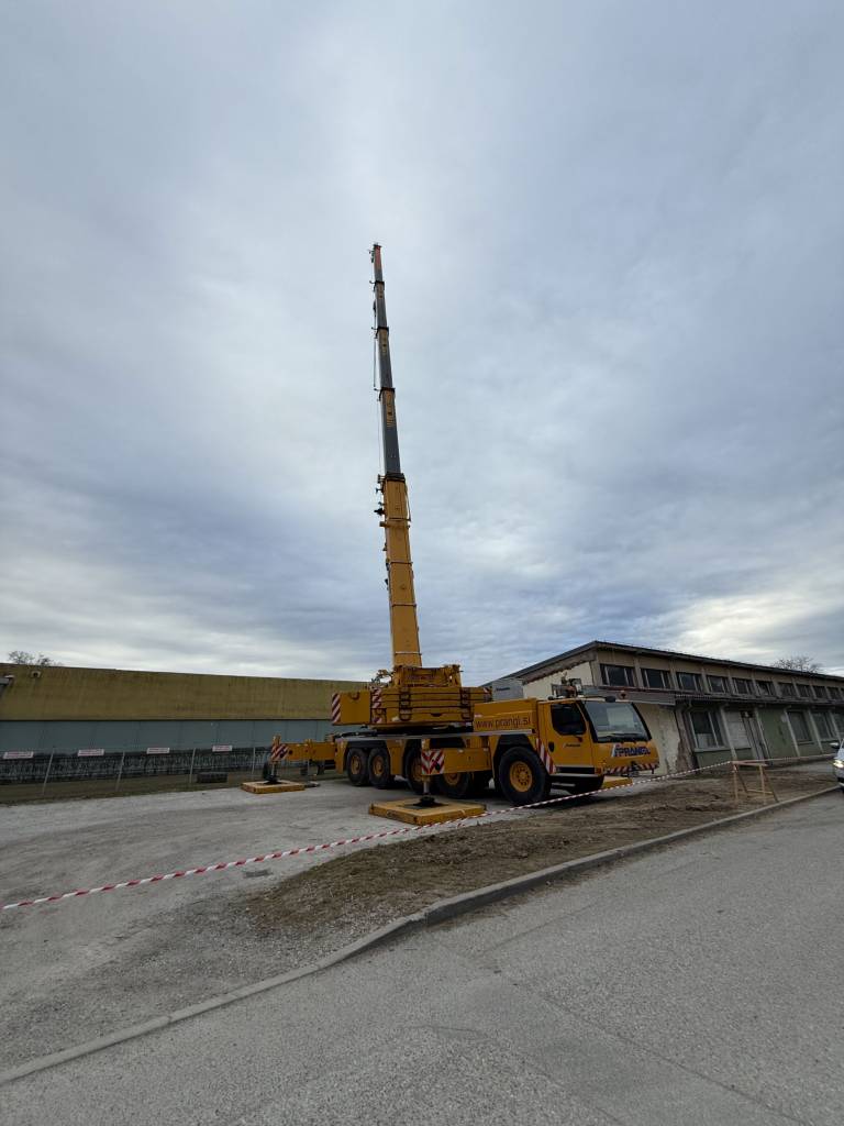 Pred Športno dvorano Vrbanska so začeli s postavljanjem ogromnega dvigala, s katerim bodo danes in jutri odstranjevali valovito pločevino, nosilce in prod.