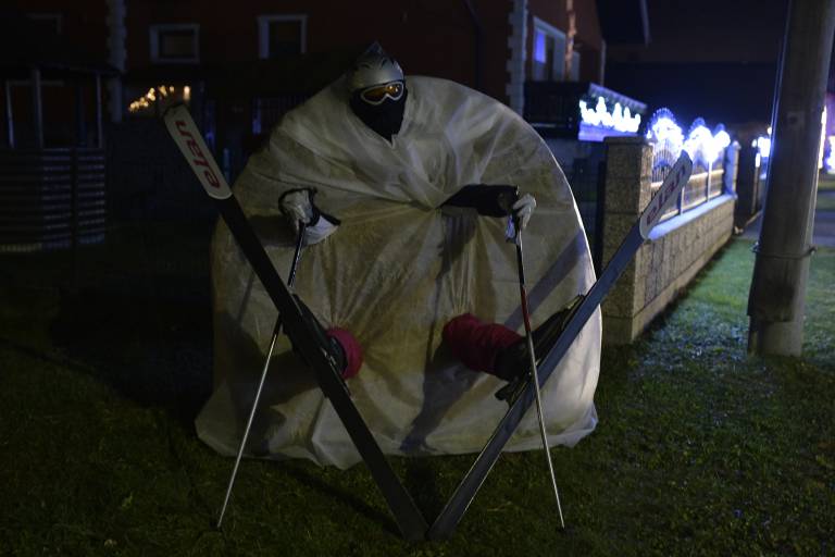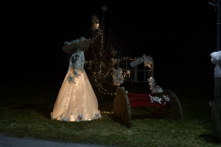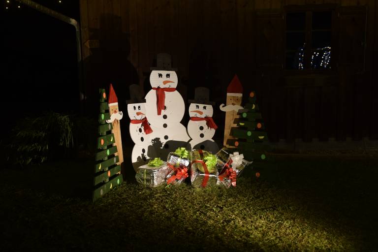 Tematsko dodajo vsako leto kakšen nov okrasek - predlani lesene palčke, lani smrekice ob poti skozi vas, letos pa skupino snežakov.