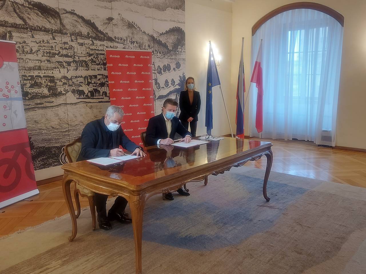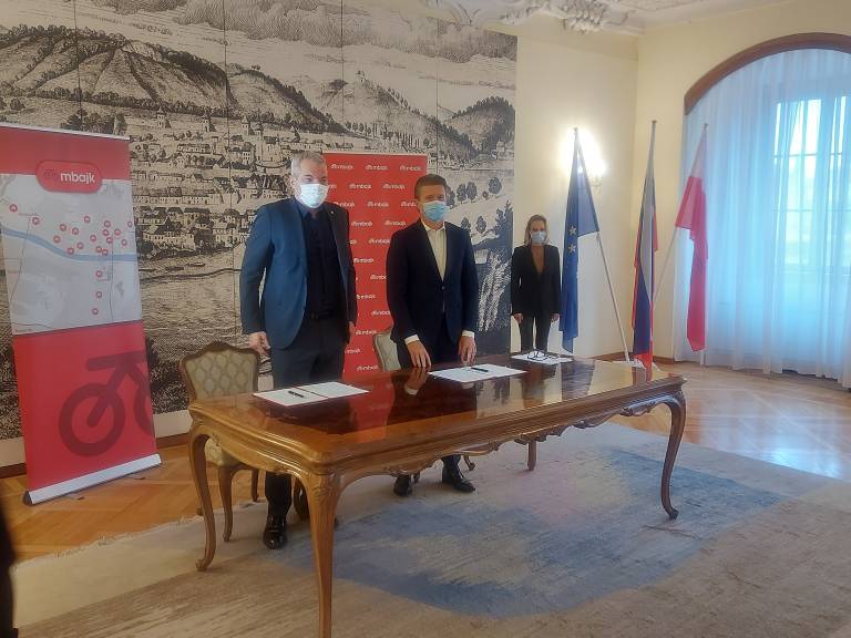 Župan Mestne občine Maribor Saša Arsenovič in direktor podjetja Europlakat Marko Kolbl sta danes podpisala dogovor o vzpostavitvi in obratovanju sistema izposoje oziroma souporabe koles v Mariboru z izmenom MBajk.