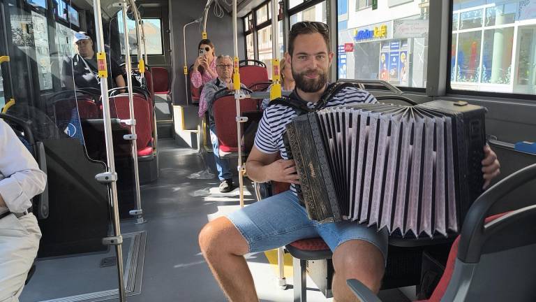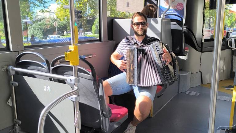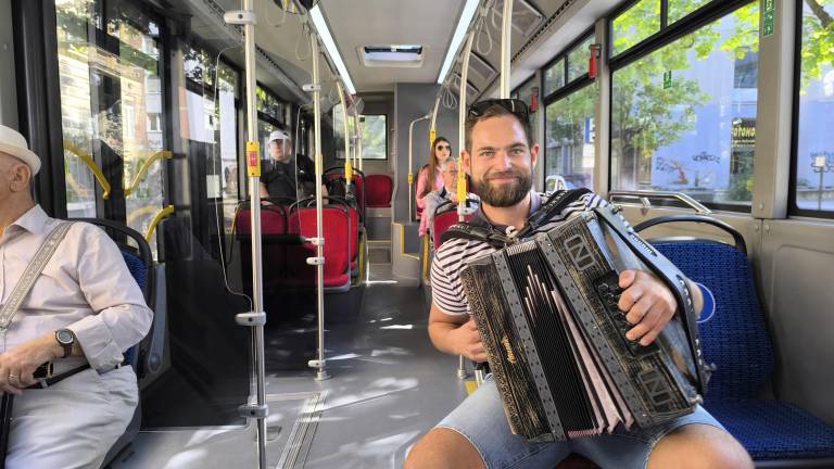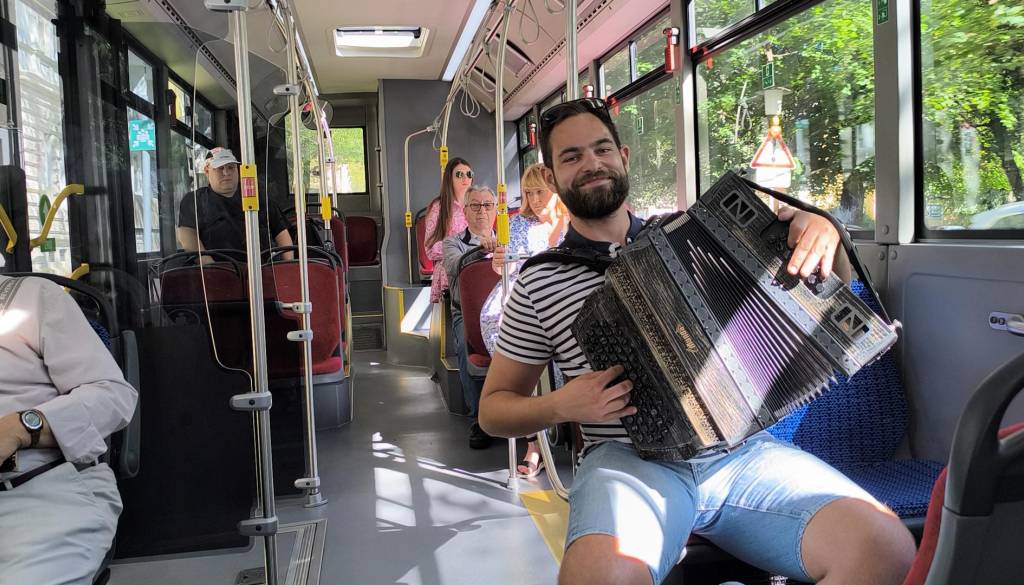 Ko smo se okoli 11. ure usedli na avtobus, je bilo vzdušje že drugačno kot običajno. Namesto šumenja mestnega prometa nas je pričakala glasba. Taka prava domača. Na avtobus je namreč sedel harmonikar Peter Prohart in s svojo glasbo spremenil običajno mestno vožnjo v pravo kulturno doživetje.