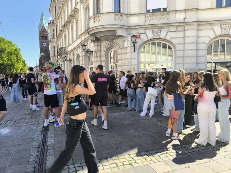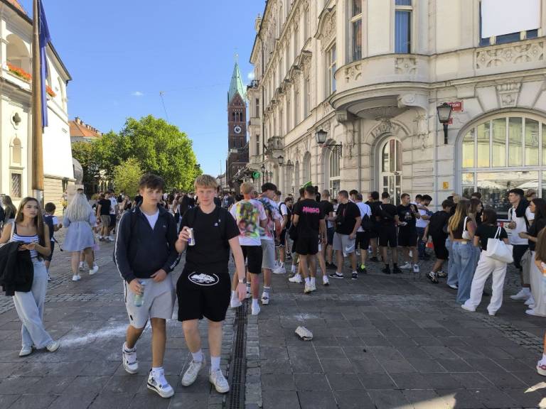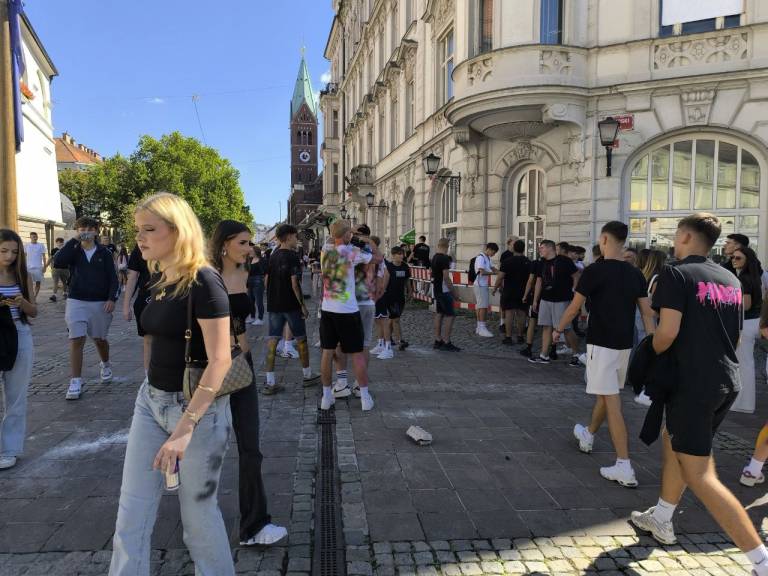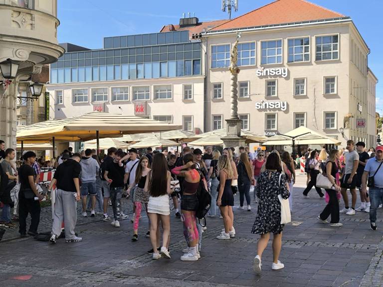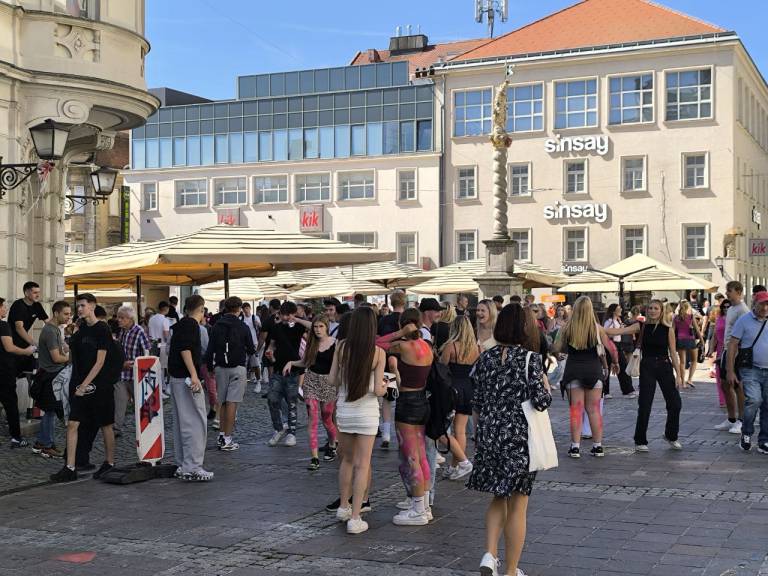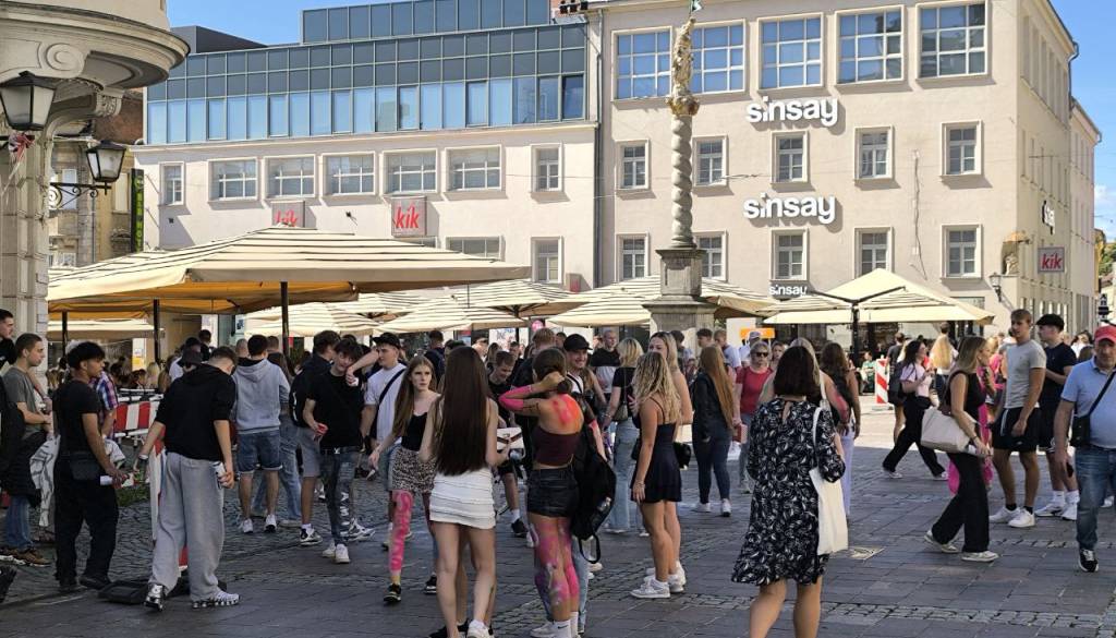 V središču Maribora se je danes zbrala množica mladih, predvsem dijakov prvih letnikov, ki so popisani po telesu, barvami in glasnim druženjem obeležili začetek šolskega leta.