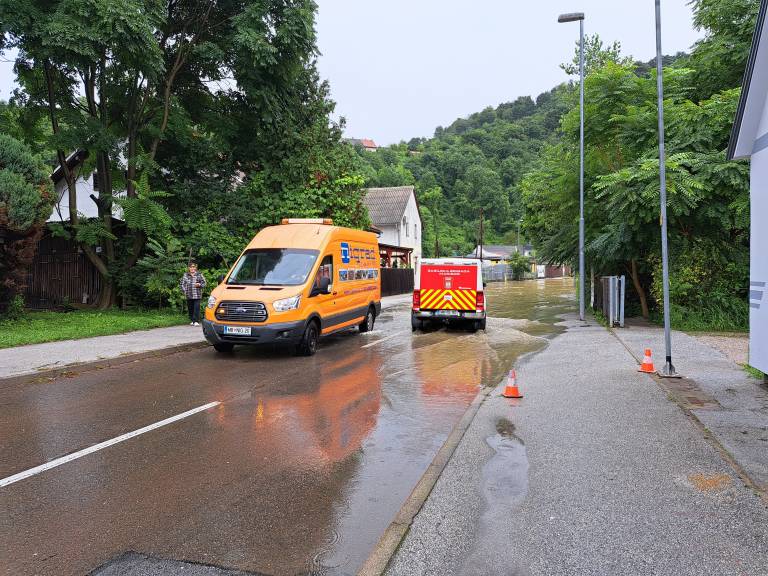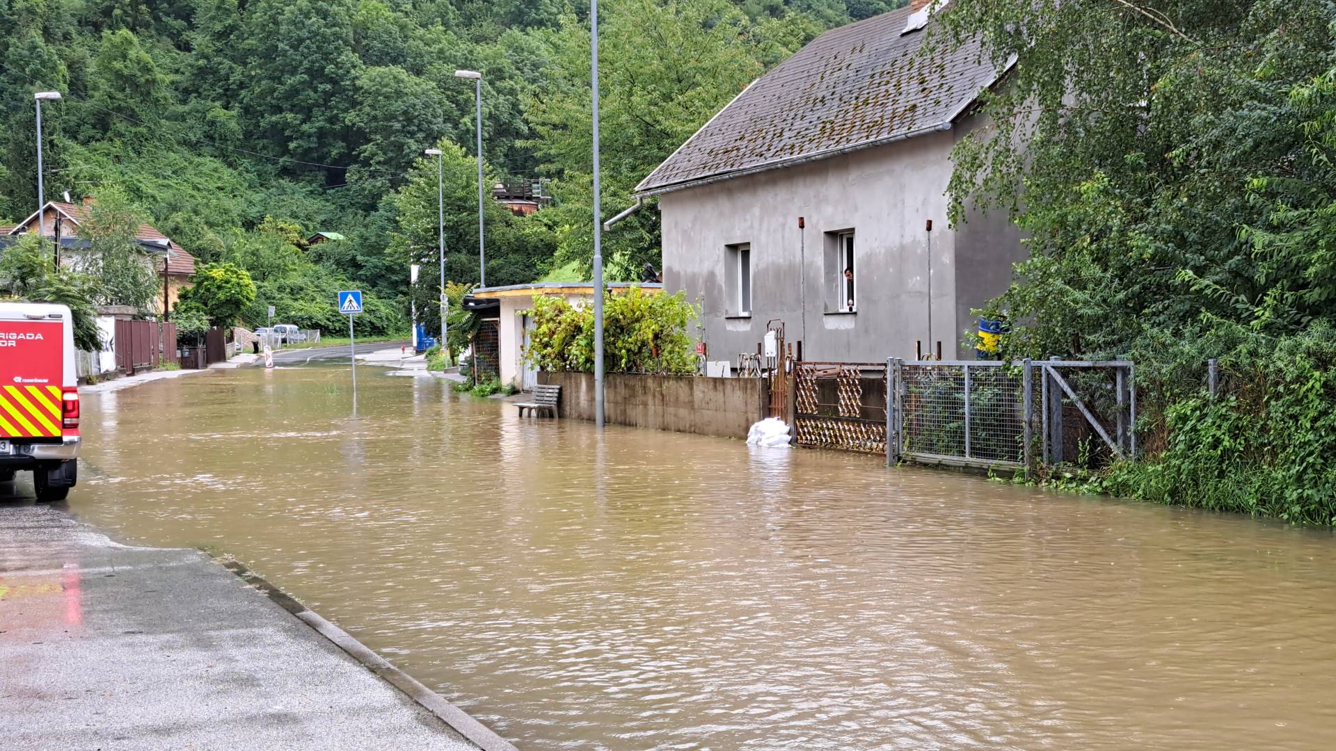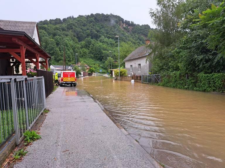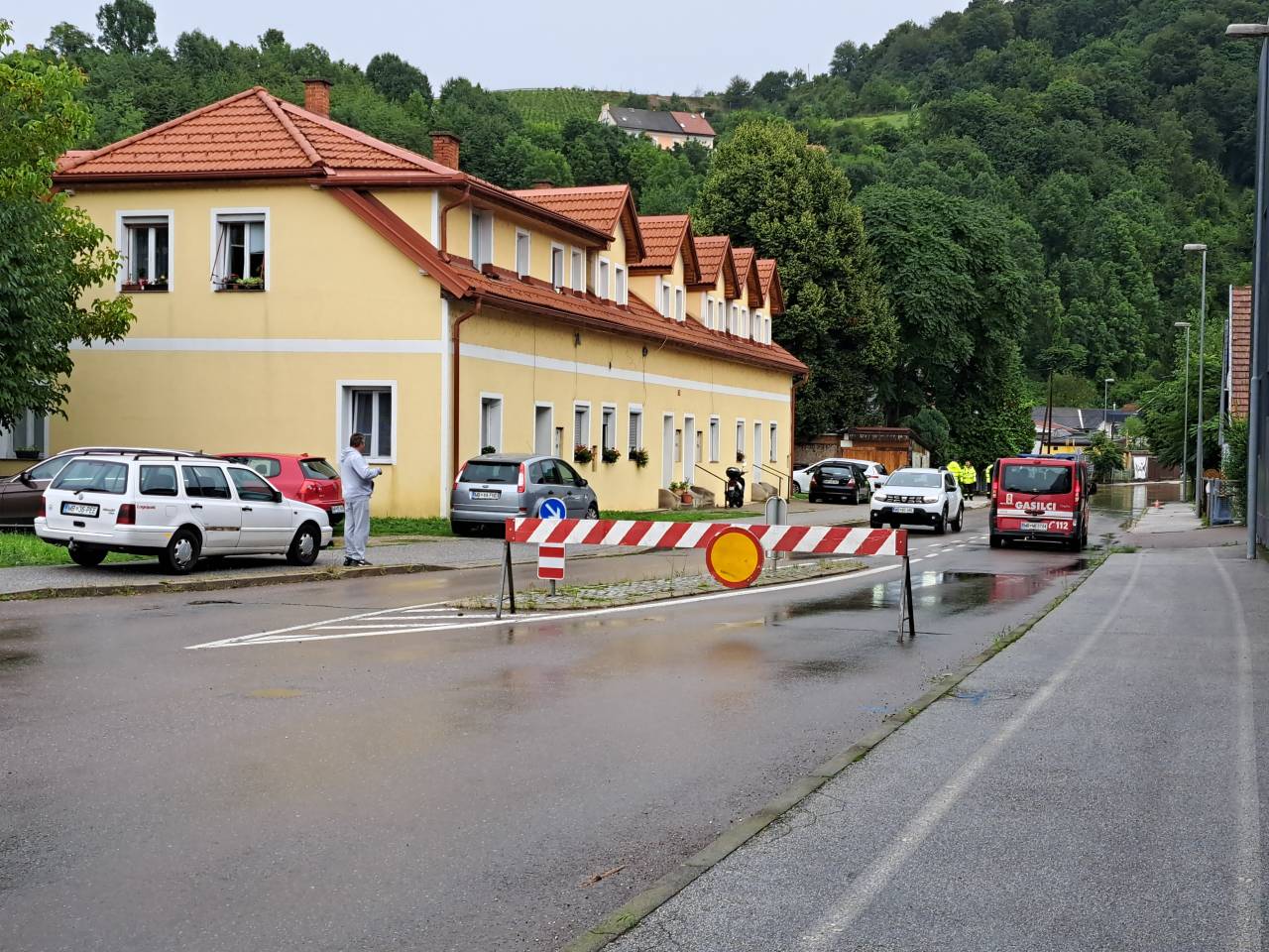 Poplavljena je cesta, na terenu so gasilci, domačinom pomagajo tudi s protipoplavnimi vrečami.