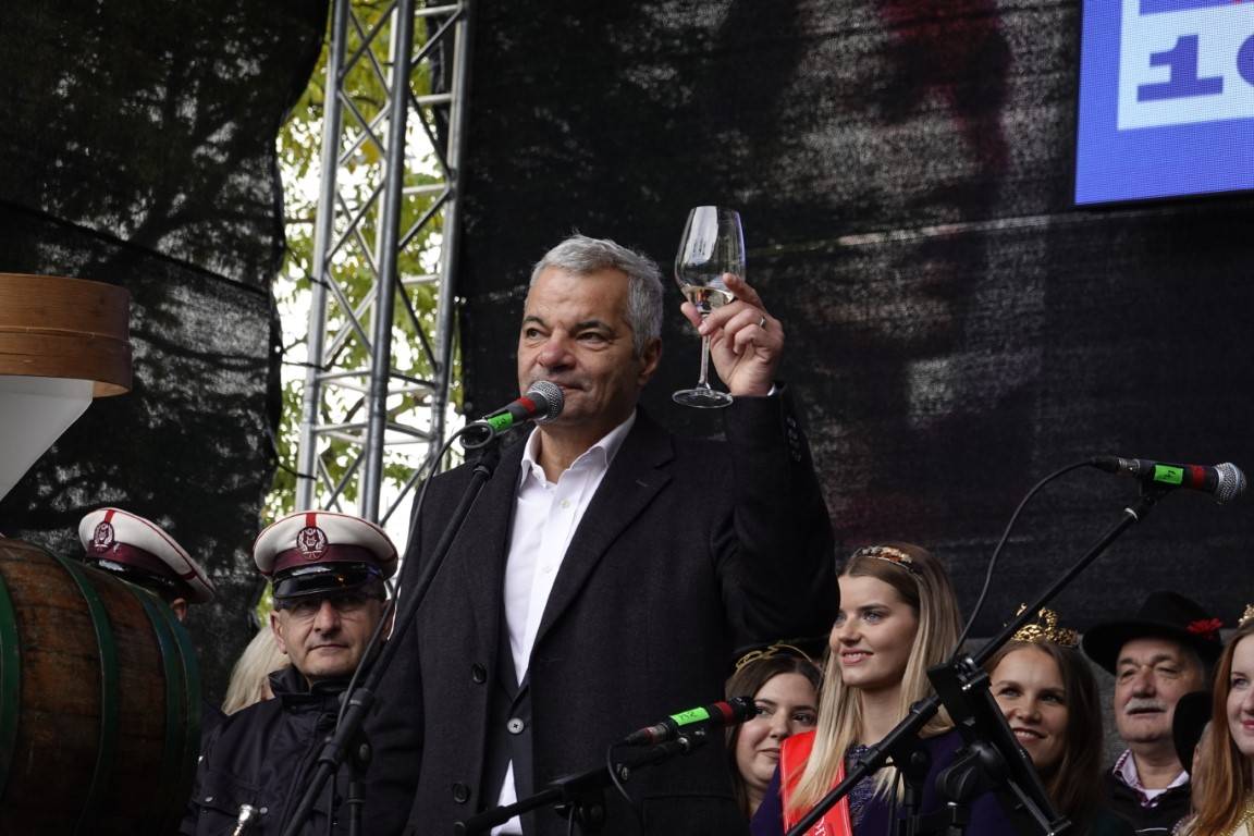 Ob 13. uri je župan Saša Arsenovič na odru na Trgu Leona Štuklja krstil mošt in ga tako spremenil v vino.