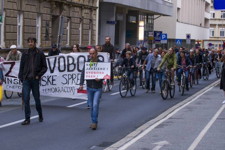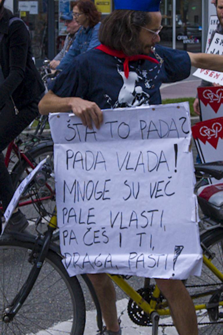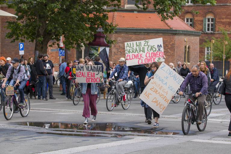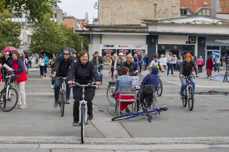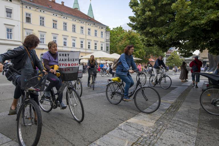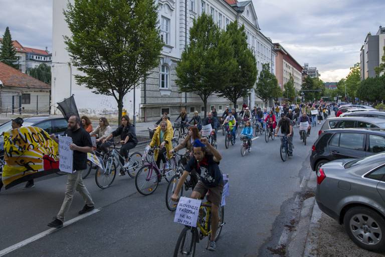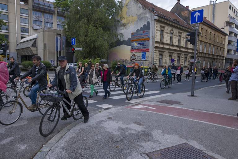 Tudi tokrat so se zbrali ob 19. uri na Trgu svobode in s kolesi krožili okoli spomenika NOB. Skupno se je protestnikov zbralo okoli 350.
