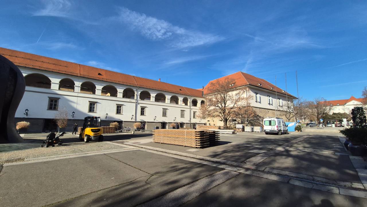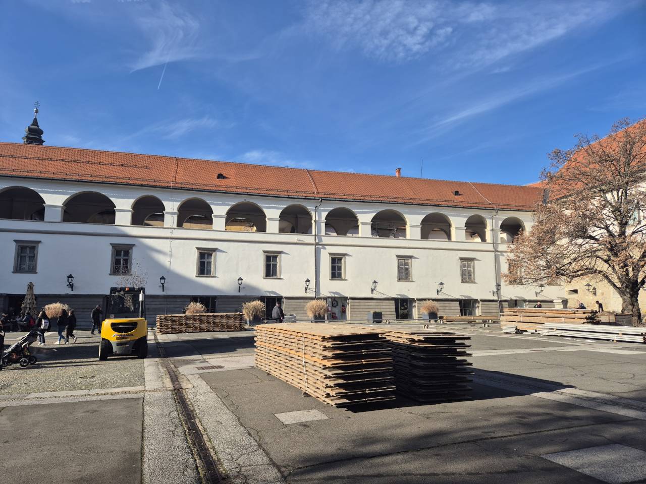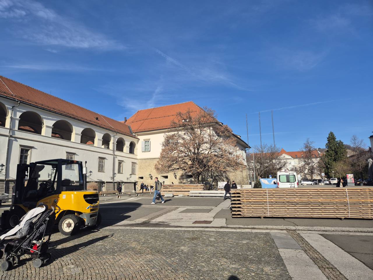 Na Trgu svobode v Mariboru se je začelo urejanje prizorišča, kjer bo prihodnji teden zaživelo Čarobno drsališče. Delavci so dopoldne na trg pripeljali prve lesene plošče in konstrukcijske elemente, s katerimi bodo v naslednjih dneh oblikovali ledeno ploskev.