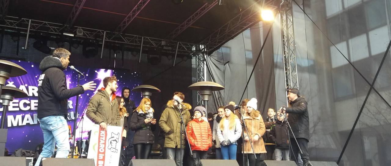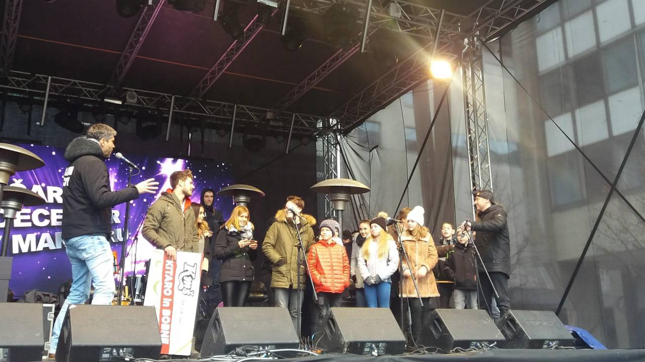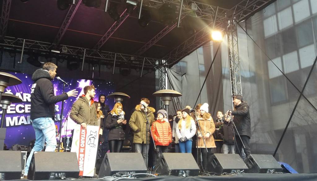 Marko Soršak - Soki tudi v decembrskih dneh ne počiva. Danes je na Trgu Leona Štuklja ponovno presenetil otroke v sklopu projekta 20 za 20 in jim podaril set bobnov in kitaro.