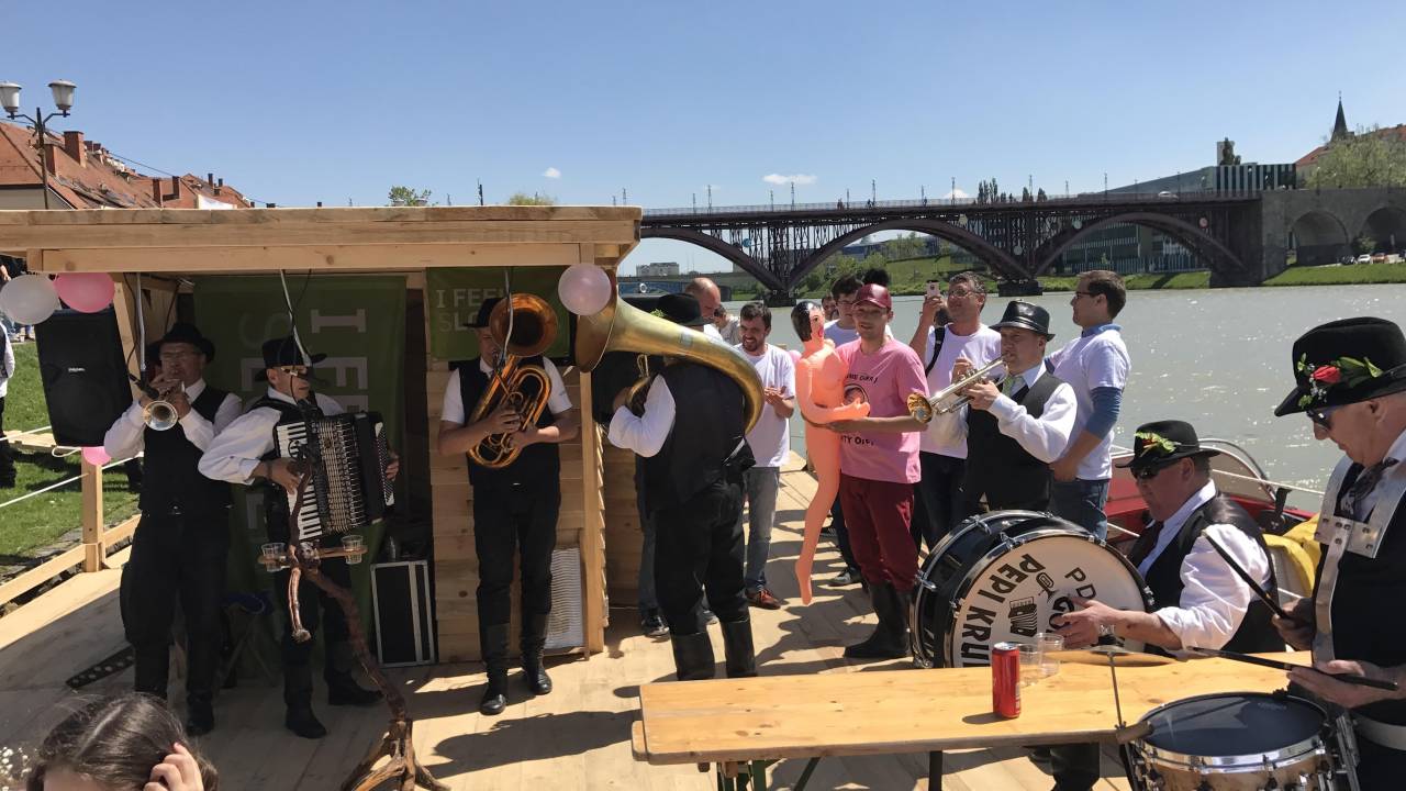 Med poročno veselico je okoli 20 veseljkov nepričakovano prišlo na splav in vidno izstopalo. S seboj so vozili banjo z žarom, lačnim ustom delili čevapčiče, ki so jih pekli kar na Lentu, morali pa so izpolnjevati tudi razne izzive. Med njimi je bilo opaziti tudi štajerskega slavčka Damjana Murka.