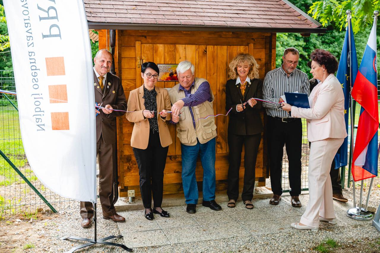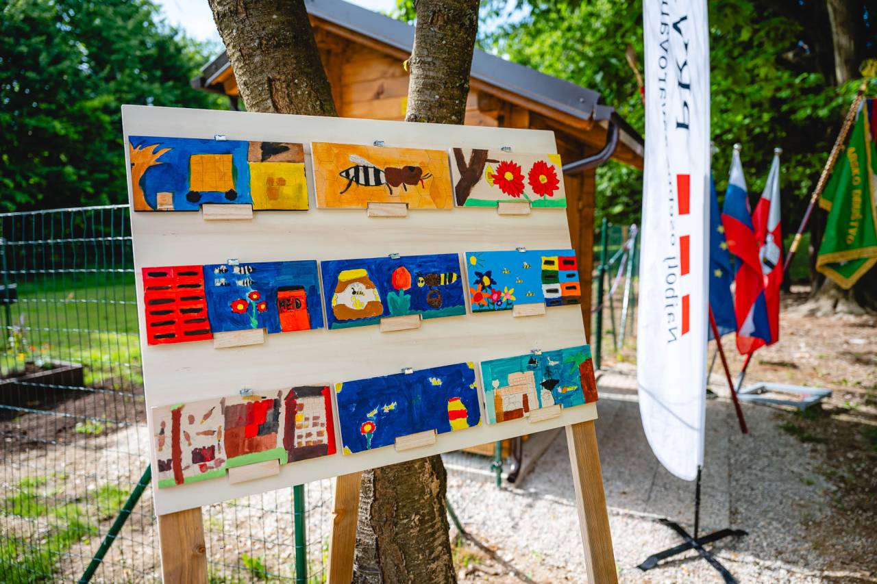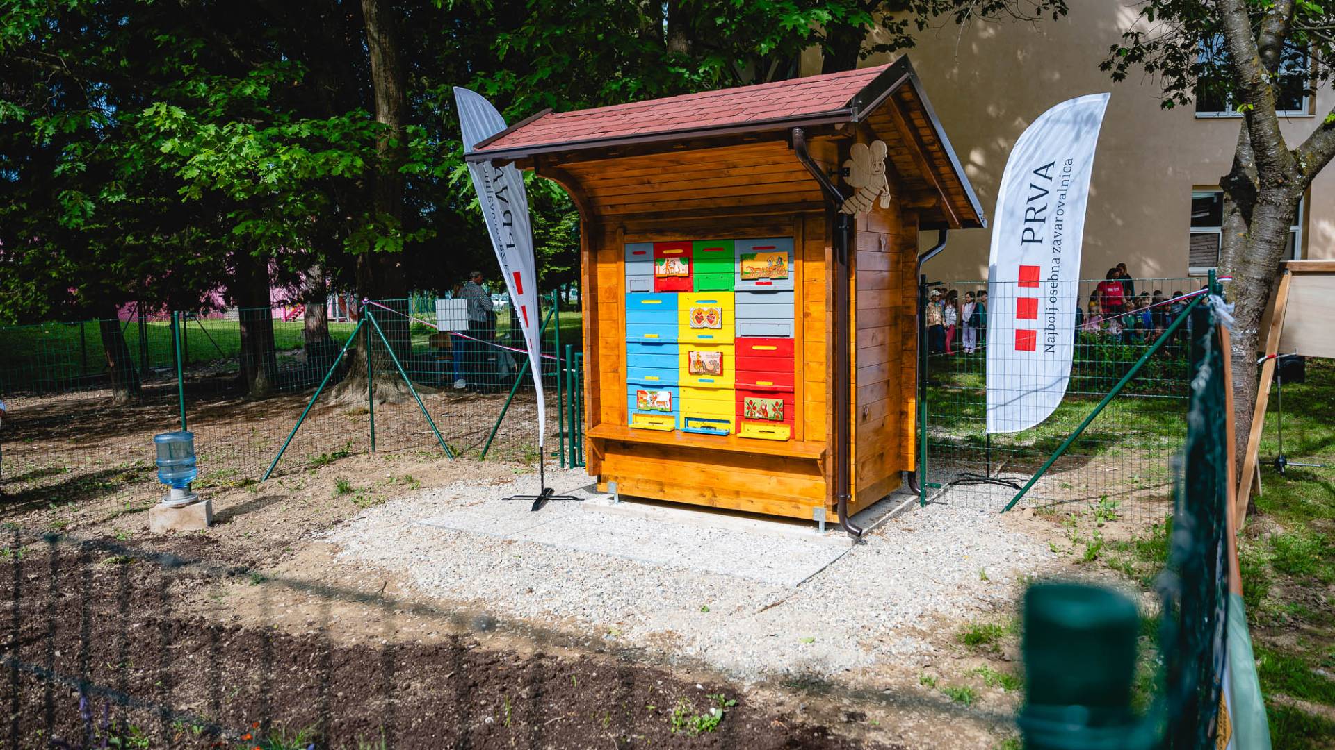 Na dvorišču Osnovne šole Kamnica so slovesno prerezali otvoritveni trak novega učnega čebelnjaka.