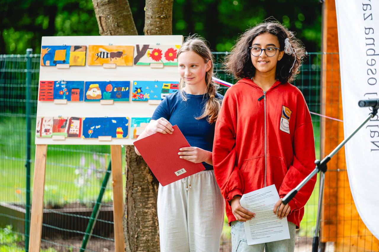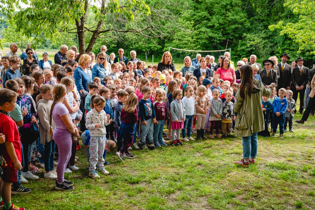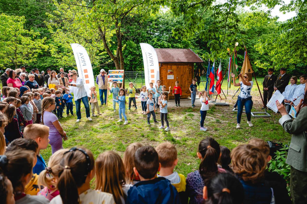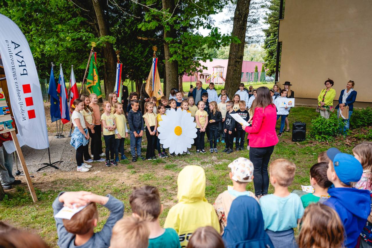 Na dvorišču Osnovne šole Kamnica so slovesno prerezali otvoritveni trak novega učnega čebelnjaka.
