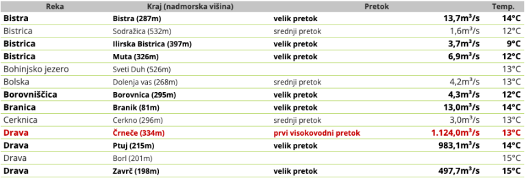 Večina rek v osrednji Sloveniji, na Savinjskem in Kočevskem je upadla do srednje vodnatosti, drugod pa še prevladuje velika vodnatost rek. Naraščajo posamezne reke v Zgornjesavski dolini in Soča, njeni pritoki v zgornjem Posočju, ki so ponoči narasli, pa že upadajo.