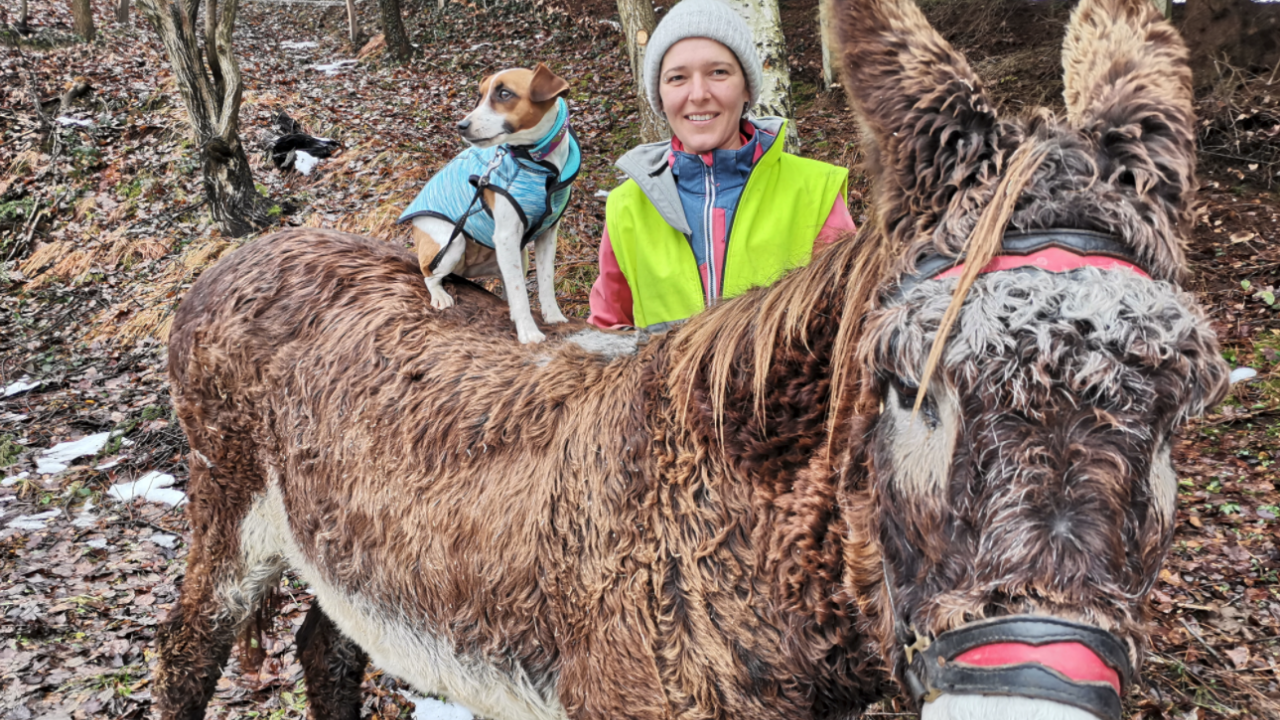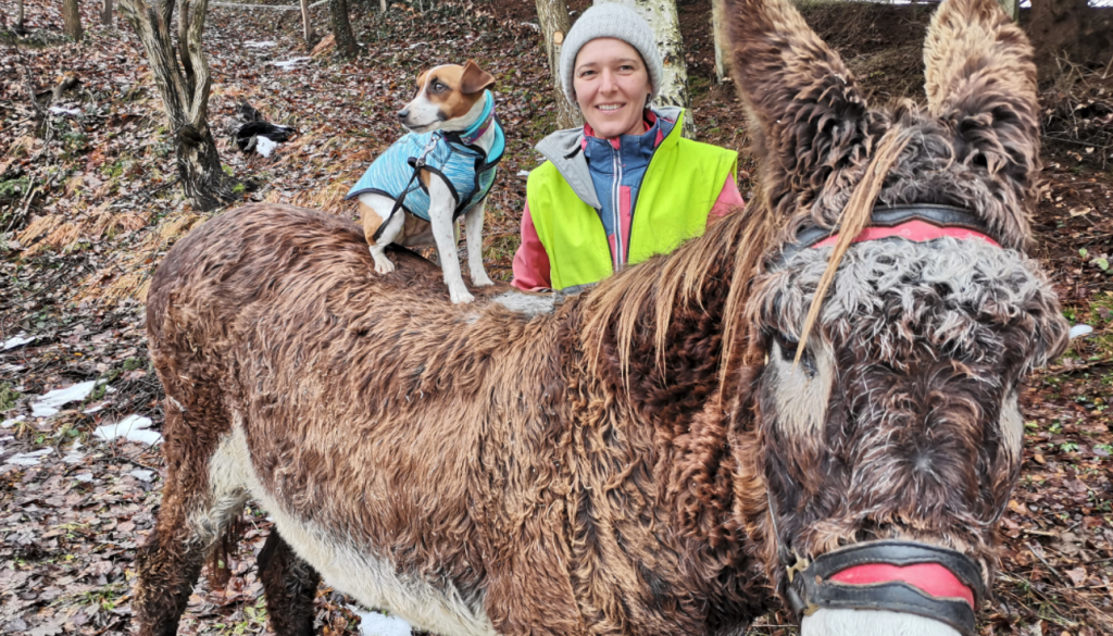 Cindy nadaljuje, da je osel dober čuvaj, saj na poti odganja tudi druge pse, ki bi se preveč približali psički Mini.